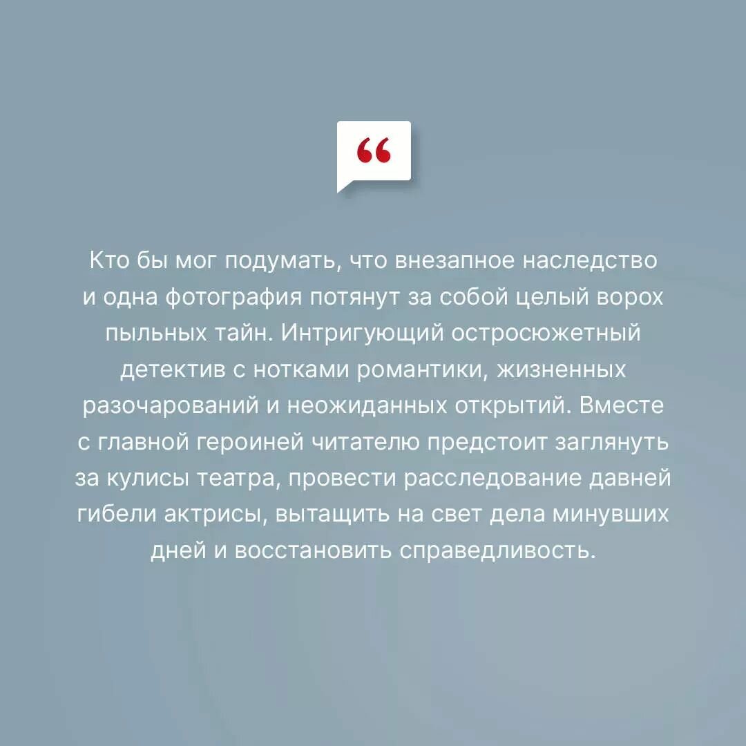 Анна выяснила, что костюм принадлежал талантливой актрисе Тамиле Тепляковой, но поговорить с ней не смогла. Оказывается, та погибла прямо во время спектакля, упав в люк под сценой, который случайно оказался открытым! И произошло это примерно в то же время, когда было сделано пугающее фото…