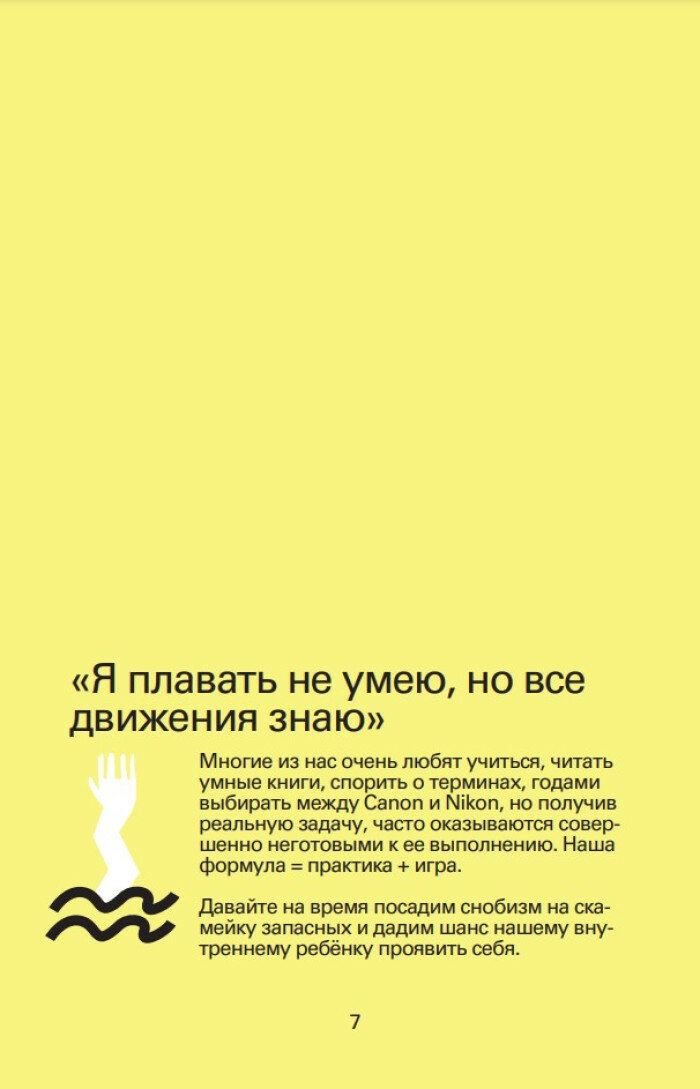 Каждое задание наполнено личными и веселыми историями Вани и Саши, которые помогают настроиться на непринужденную творческую волну и научат находить почву для новых идей в повседневных вещах: во дворе, где вы родились, в своем теле, в геометрических фигурах. Выполняйте задания в любое время, отвечайте на вопросы авторов, саморефлексируйте и вдохновляйтесь референсами знаменитых фотографов и художников, изучая их работы по куар-кодам.