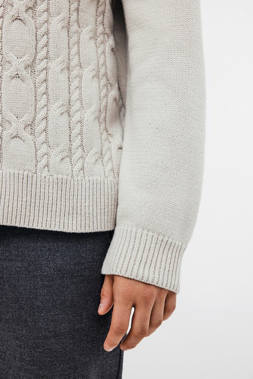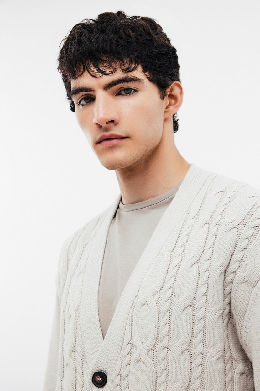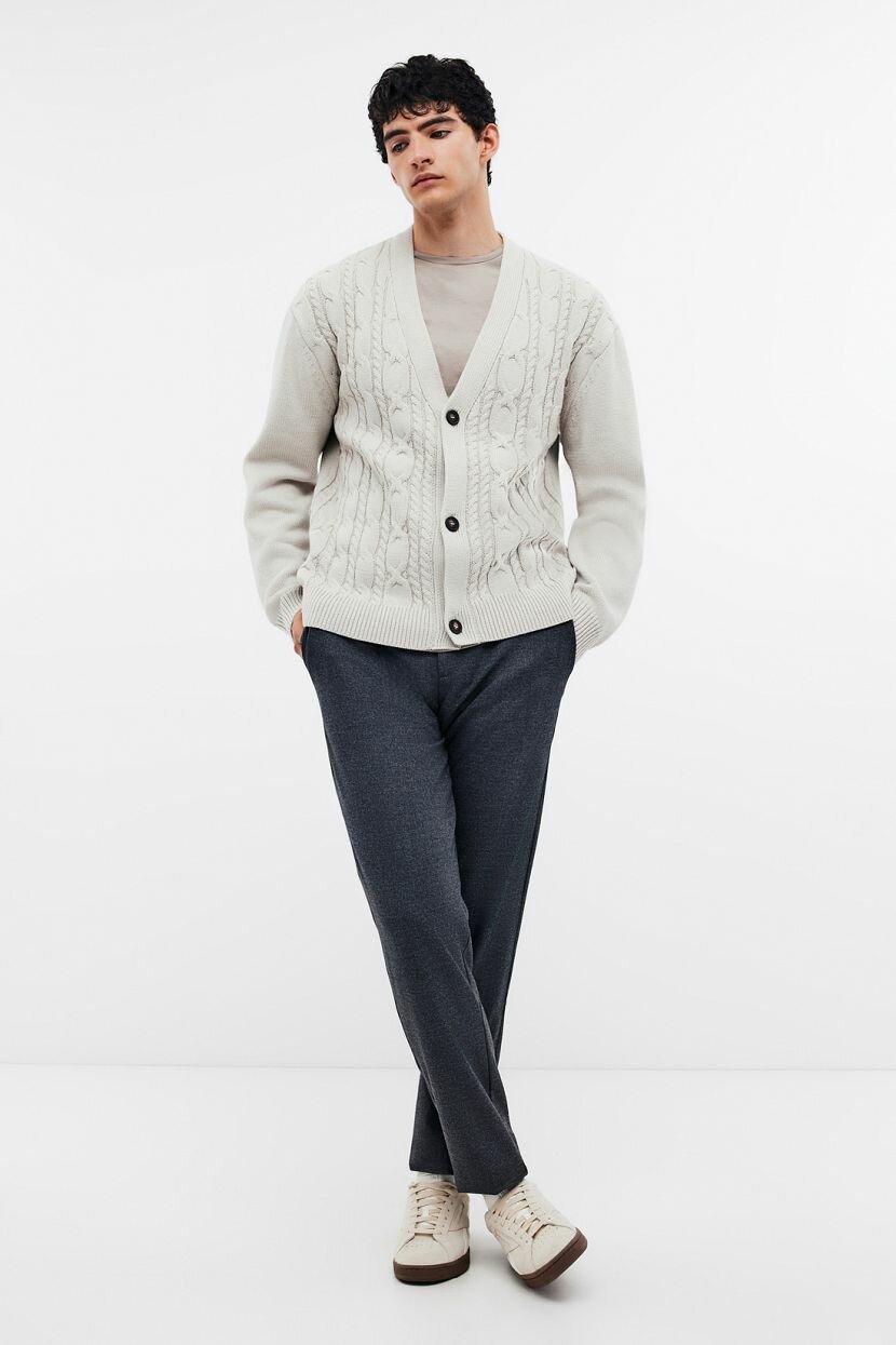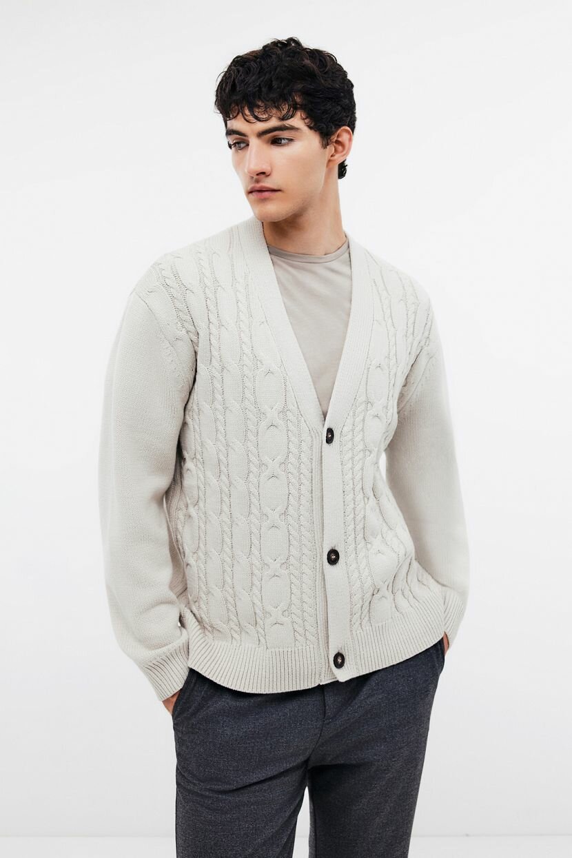 Вязаный мужской кардиган - классическая составляющая гардероба, которая прекрасно подойдет для любого времени года. V-образный вырез позволяет составлять выразительные комплекты с вещами в повседневном и деловом стиле, открывая возможности для стилизации. В качестве застежки использованы три роговые пуговицы. Полочка декорирована объемным узором “косы”. Это решение уравновешено спинкой и рукавами из гладкого трикотажа. Манжеты и низ связаны трикотажной резинкой за счет чего достигается оптимальное прилегание. Изделие выполнено из тонкой смесовой хлопковой пряжи. Материал мягкий и долгое время способен сохранять безупречный внешний вид. Он не требует специального ухода и отличается малой сминаемостью. Синтетические волокна препятствуют деформации и повышают эластичность полотна.