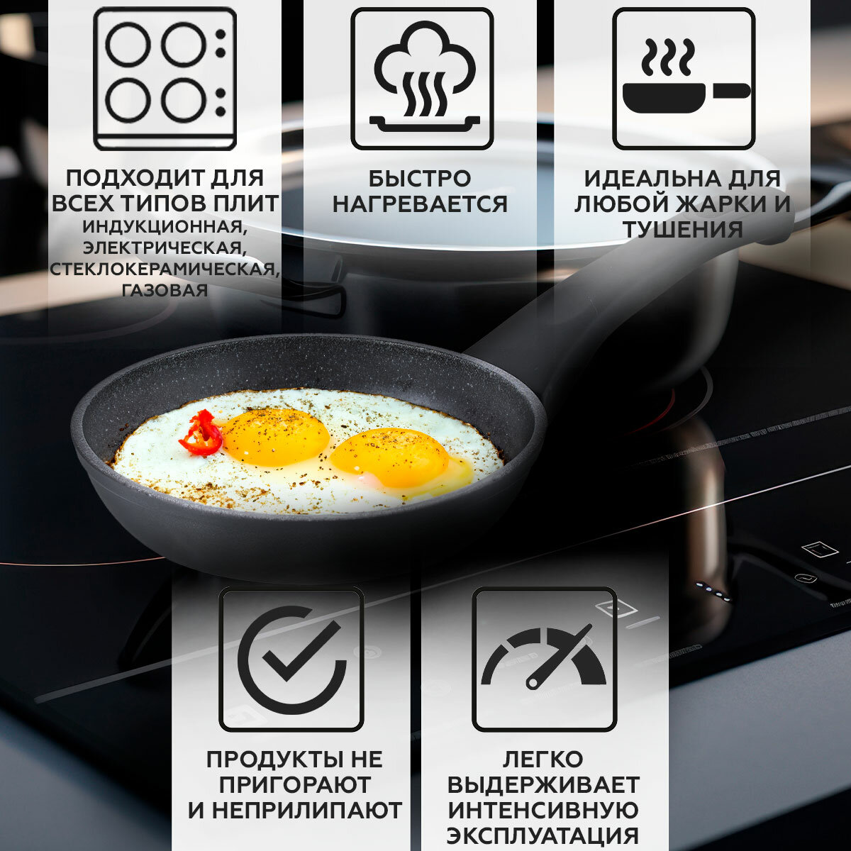 Сковорода диаметром 16 см и высотой стенок 4 см идеально подходит для приготовления порционных блюд, ее быстро и удобно мыть.