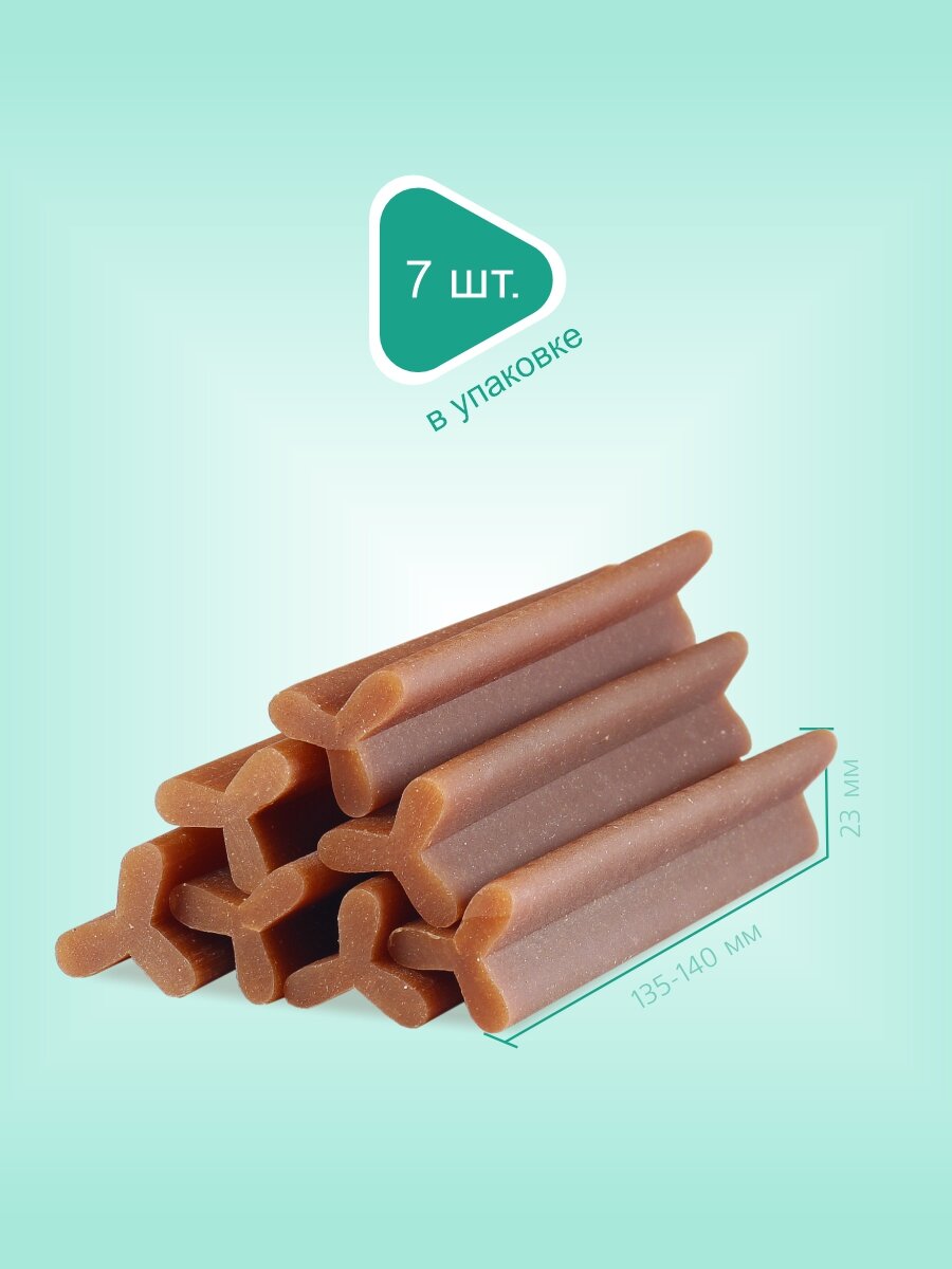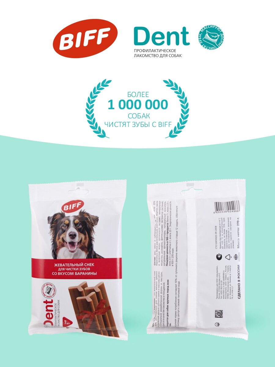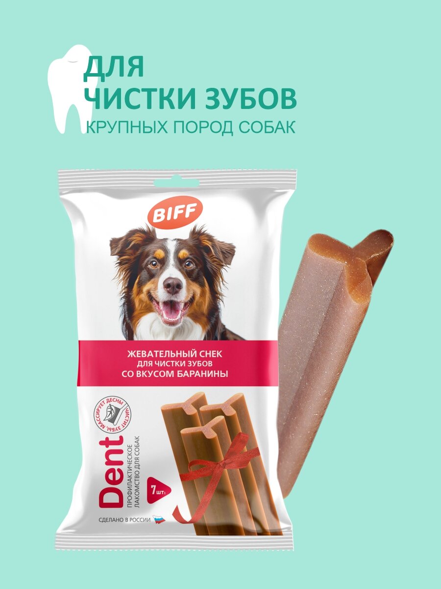 Biff Dental Care - это жевательный снек, необходимый для ежедневной чистки зубов собак. Особая текстура и форма способствуют эффективному снятию мягкого зубного налета, снижению риска образования зубного камня и массажу десен. Фитокомплекс экстрактов растений предотвращает размножение вредных бактерий и освежает дыхание. В отличии от аналогов, в составе нет курицы, которая чаще всего вызывает аллергическую реакцию у питомца. Лакомства – это дополнительное питание, не заменяющее ежедневное полноценное кормление. Пожалуйста, оставляйте питомцу миску со свежей питьевой водой. Лакомства компании Biff производятся только в России, из высококачественного сырья, поставляемого Российскими фермерскими хозяйствами. Производство сертифицировано по международным стандартам HACCP ISO 22000:2005 в области безопасности пищевой продукции.
