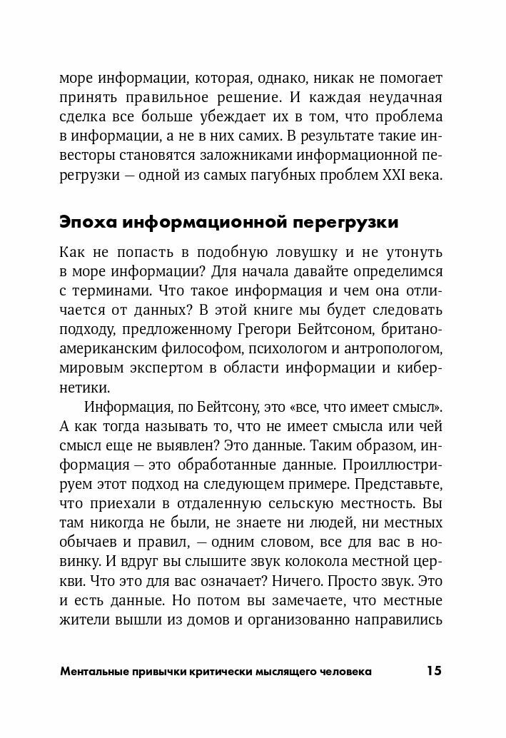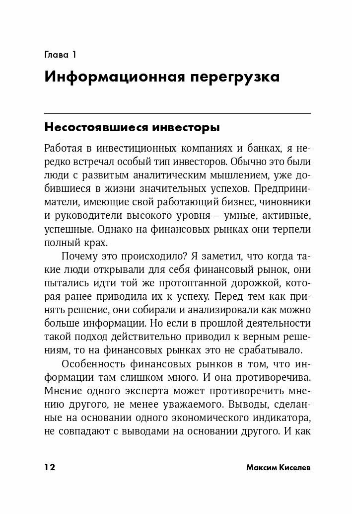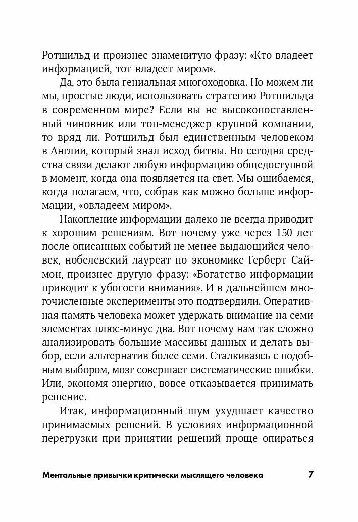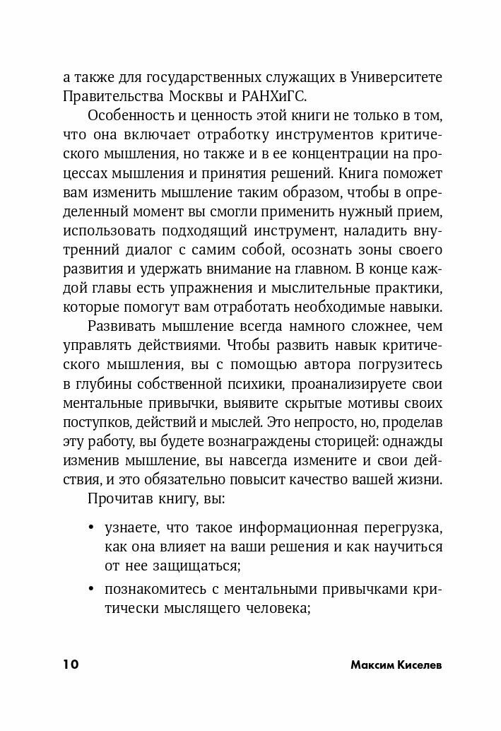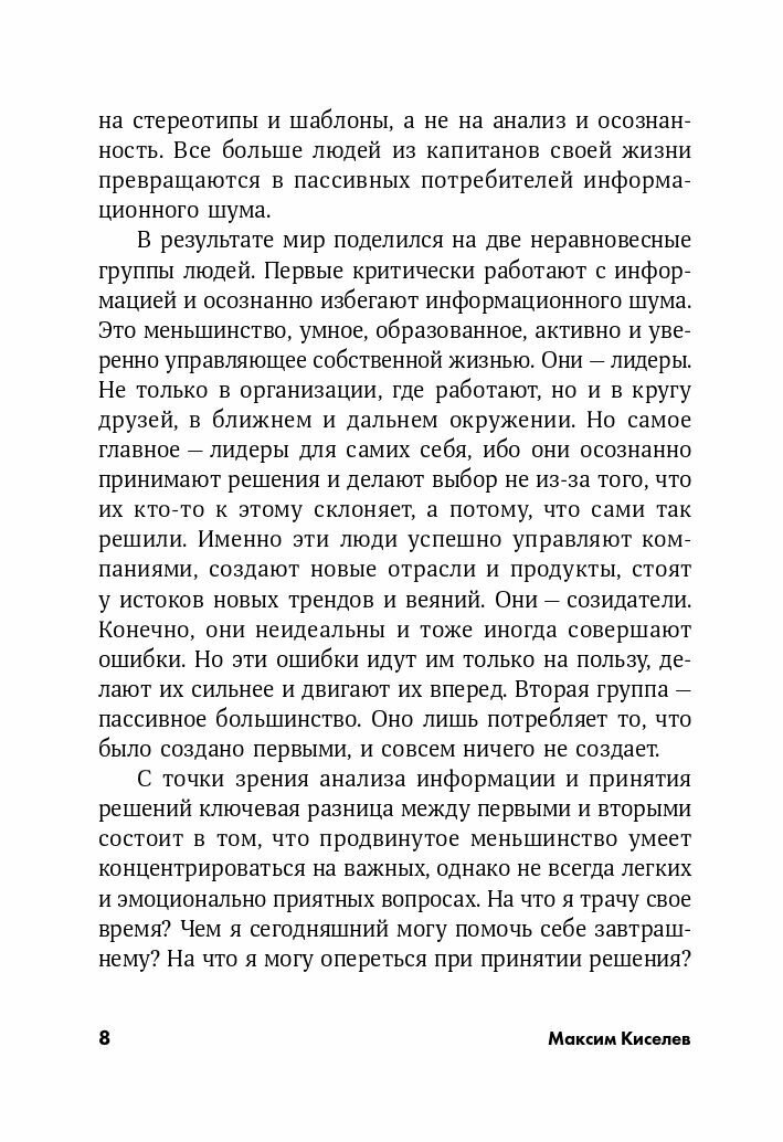 Работающие инструменты по освоению навыков критического мышления, необходимых для человека, который хочет сам управлять своей жизнью, а не быть жертвой информационного шума.Упражнения и мыслительные практики помогут ориентироваться в информационном шуме, контролировать потоки информации, отличать фейки от фактов, принимать верные решения.Автор бизнес-тренер «Газпром корпоративный институт», Корпоративного университета РЖД, Университета Правительства Москвы.Книга поможет настроить мышление так, чтобы в нужный момент вы могли удерживать внимание на главном.Объем данных растет с бешеной скоростью во всех сферах нашей жизни. С одной стороны, чем больше информации, тем больше выбора. С другой нам все труднее отделять правду от лжи, а фейки от фактов. На помощь приходит один из важнейших навыков современного человека критическое мышление, умение сомневаться в получаемой информации. Ведь непредвзятый взгляд на проблему может обогатить нас новыми знаниями и помочь пересмотреть устаревшие убеждения.Автор книги Максим Киселев, бизнес-тренер, автор курса «Критическое мышление», уверен, что, корректируя собственные ментальные установки, можно научиться контролировать поступающие данные, а также хорошо в них ориентироваться. В книге даны упражнения и мыслительные практики, которые помогут избежать ловушек мышления и обращать кризисные ситуации себе на пользу с опорой на анализ и осознанность. Эти навыки пригодятся как для принятия важных бизнес-решений, так и для распознавания ложной информации в повседневной жизни.Цитаты:"Все чаще мы неосознанно попадаем под влияние информационного шума, который эмоционально очень привлекателен, но абсолютно бесполезен, а нередко даже и вреден.""Зарабатывают на бирже те, кто мыслит критически. Они опираются не на ту информацию, которую легко достать, отправив пару запросов в интернет, а на ту, которая имеет значение в данный момент.""Данные это шум. Информация это обработанные данные. Информация всегда имеет смысл. И ее всегда меньше, чем данных.""Во время Первой мировой войны одну французскую девушку, крестьянку по происхождению, контузило взрывом разорвавшегося снаряда. Некоторое время она пребывала в коме, а когда пришла в себя заговорила на латыни. Выяснилось, что до пяти лет она вместе с мамой проживала в доме священника. Мама работала в этом доме прислугой. И девочка в первые пять лет жизни часто слышала фразы на латыни!"