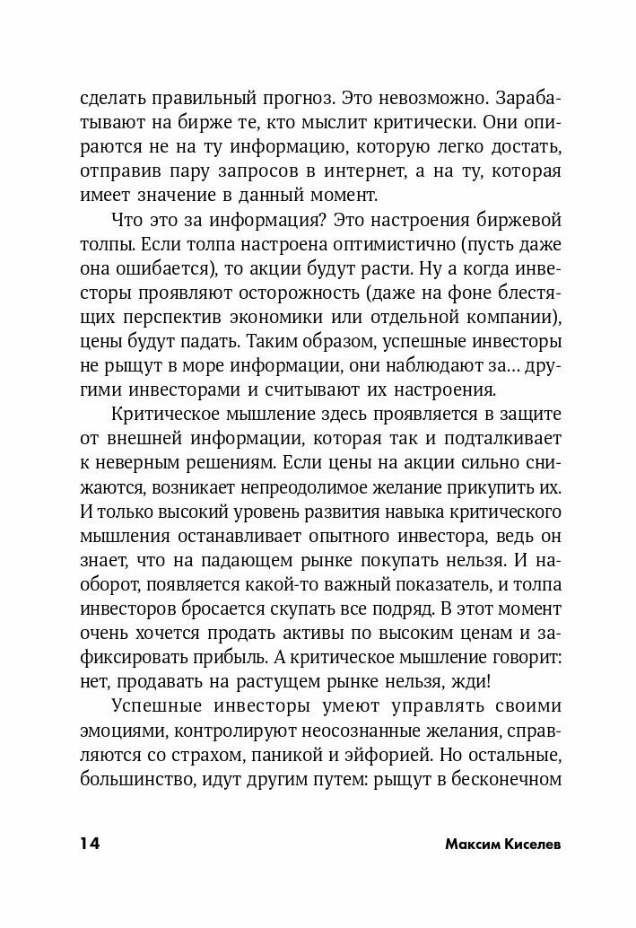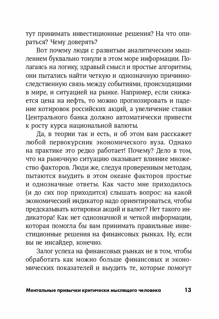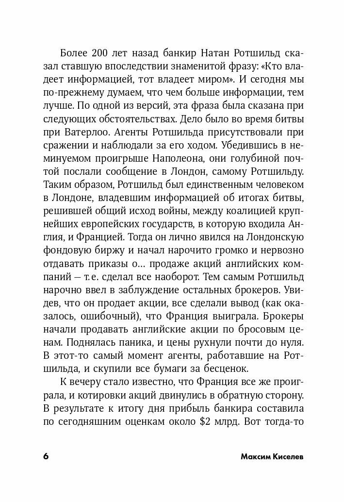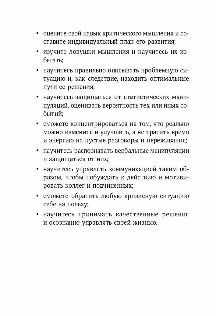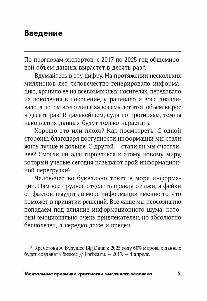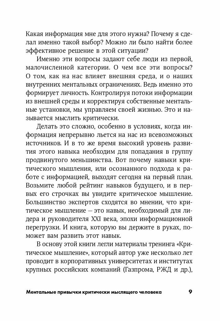 Работающие инструменты по освоению навыков критического мышления, необходимых для человека, который хочет сам управлять своей жизнью, а не быть жертвой информационного шума.Упражнения и мыслительные практики помогут ориентироваться в информационном шуме, контролировать потоки информации, отличать фейки от фактов, принимать верные решения.Автор бизнес-тренер «Газпром корпоративный институт», Корпоративного университета РЖД, Университета Правительства Москвы.Книга поможет настроить мышление так, чтобы в нужный момент вы могли удерживать внимание на главном.Объем данных растет с бешеной скоростью во всех сферах нашей жизни. С одной стороны, чем больше информации, тем больше выбора. С другой нам все труднее отделять правду от лжи, а фейки от фактов. На помощь приходит один из важнейших навыков современного человека критическое мышление, умение сомневаться в получаемой информации. Ведь непредвзятый взгляд на проблему может обогатить нас новыми знаниями и помочь пересмотреть устаревшие убеждения.Автор книги Максим Киселев, бизнес-тренер, автор курса «Критическое мышление», уверен, что, корректируя собственные ментальные установки, можно научиться контролировать поступающие данные, а также хорошо в них ориентироваться. В книге даны упражнения и мыслительные практики, которые помогут избежать ловушек мышления и обращать кризисные ситуации себе на пользу с опорой на анализ и осознанность. Эти навыки пригодятся как для принятия важных бизнес-решений, так и для распознавания ложной информации в повседневной жизни.Цитаты:"Все чаще мы неосознанно попадаем под влияние информационного шума, который эмоционально очень привлекателен, но абсолютно бесполезен, а нередко даже и вреден.""Зарабатывают на бирже те, кто мыслит критически. Они опираются не на ту информацию, которую легко достать, отправив пару запросов в интернет, а на ту, которая имеет значение в данный момент.""Данные это шум. Информация это обработанные данные. Информация всегда имеет смысл. И ее всегда меньше, чем данных.""Во время Первой мировой войны одну французскую девушку, крестьянку по происхождению, контузило взрывом разорвавшегося снаряда. Некоторое время она пребывала в коме, а когда пришла в себя заговорила на латыни. Выяснилось, что до пяти лет она вместе с мамой проживала в доме священника. Мама работала в этом доме прислугой. И девочка в первые пять лет жизни часто слышала фразы на латыни!"