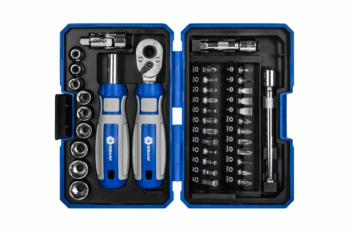 **Набор торцевых головок ударных Кобальт 915-069** представляет собой комплект из нескольких насадок разной размерности. Он позволяет проводить работы с разными типами крепежей. Для удобства в нем поставляется две рукоятки. Отверточная рукоятка используется для работы с битами. Благодаря встроенному магниту они крепко фиксируются в ней, не выпадая во процессе трудовой деятельности. Трещоточная рукоятка совместима с головками и битами, при этом использование переходника не требуется. Набор прослужит долгие годы без потери своих качеств. Все детали помещены в специальный кейс, который упрощает процесс транспортировки и хранения. Он изготовлен из ударопрочного материала, который устойчив к воздействию разных технических жидкостей.