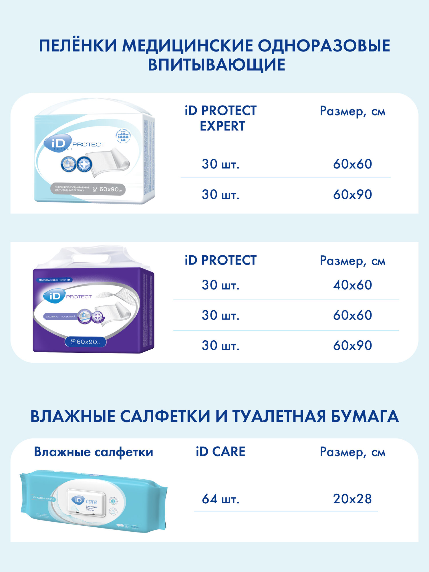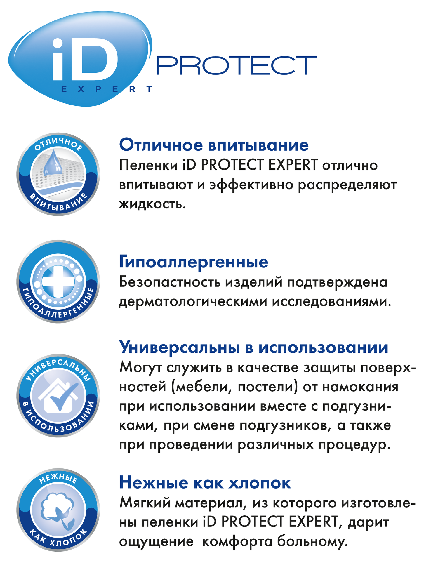 Одноразовые пеленки iD Protect Expert это изделие медицинского назначения. Они подойдут для домашнего использования или при посещении врача. Предназначены для ухода за взрослыми в качестве средства личной гигиены для дополнительной защиты мебели, постельного белья и других поверхностей от намокания. Одноразовые пеленки с наполнением из целлюлозы быстро впитывают влагу, нейтрализуют запах. Мягкий верхний слой выполнен из гидрофильного нетканого материала, впитывающий слой из целлюлозы, нижний слой из прочного полиэтилена белого цвета. Пеленки iD PROTECT EXPERT подходят для профессионального ухода за лежачими и малоподвижными больными. Изделия хорошо впитывают, равномерно распределяя жидкость, и надежно защищают от протеканий. iD PROTECT EXPERT изготовлены из мягкого материала, по ощущениям напоминающего хлопок, поэтому они очень приятны к телу. Материал, из которого произведены пеленки, не вызывает аллергической реакции, что подтверждают результаты клинических исследований.