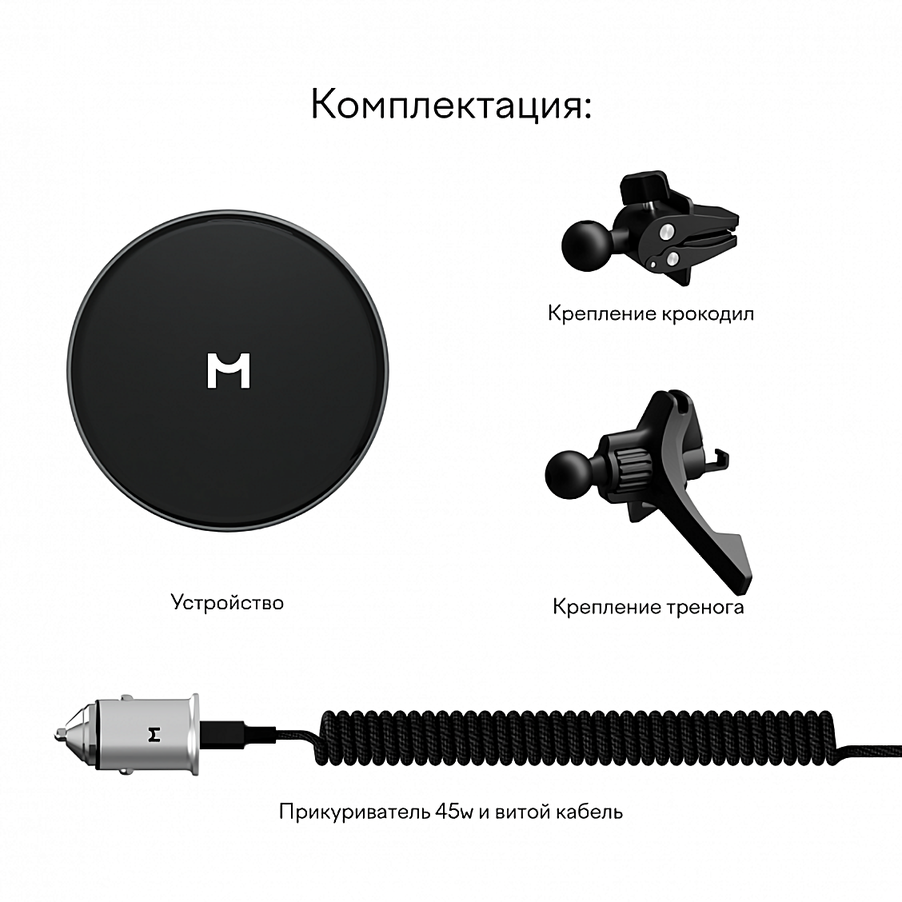 Автомобильный держатель для смартфона Magssory Disc KIT002 Silver представляет собой идеальное сочетание стиля и функциональности. Этот держатель обеспечивает надежную фиксацию телефона с помощью мощных магнитов, что гарантирует безопасность вашего устройства даже на самых неровных дорогах. Одной из ключевых особенностей является мощная и быстрая зарядка мощностью 15 Вт, поддерживающая технологию беспроводной зарядки Magsafe. В комплект входит адаптер с двумя портами USB-C мощностью 45 Вт, что позволяет заряжать несколько устройств одновременно.Корпус держателя выполнен из стильного и компактного алюминия и закаленного стекла, что придает ему современный и элегантный вид. Два вида универсального и прочного крепления на дефлектор обеспечивают надежную установку в автомобиле. Модель поддерживает различные протоколы зарядки, включая Qi, Power Delivery и Quick Charger, что делает его совместимым с широким спектром устройств.Комплектация включает в себя магнитный держатель, прикуриватель с двумя портами Type-C, провод Type-C - Type-C, крепление тринога и крепление крокодил. Входная мощность составляет 5V/2А, 9V/1.67А и 12V/2А, что обеспечивает стабильную и быструю зарядку вашего устройства. Этот автомобильный держатель для смартфона Magssory Disc KIT002 Midnight станет незаменимым аксессуаром для вашего автомобиля, обеспечивая удобство и безопасность использования вашего смартфона в дороге.