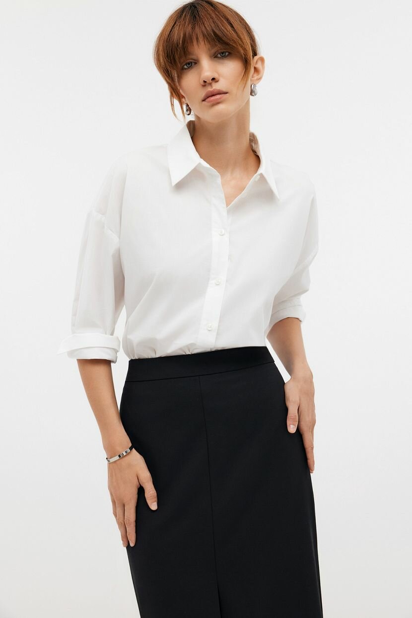 Блузка свободного силуэта в офисном стиле подойдет для повседневной жизни и работы. Модель выполнена из однотонного хлопка, что обеспечивает комфорт и легкость в носке. Отложной воротник на стойке добавляет строгий акцент, что идеально для офисного дресс-кода. Застежка с перламутровыми пуговицами придает изделию элегантный вид. Спущенное плечо и длинные рукава с манжетами на пуговицах создают изысканный женственный образ.По спинке есть имитация застежки с планкой, что добавляет интересный дизайнерский элемент. Низ изделия с закруглениями делает его более необычным и привлекает внимание к деталям. Состав ткани позволяет коже дышать, обеспечивая комфорт в течение всего дня. Спущенный длинный рукав и отложной воротник подчёркивают стильность модели.
