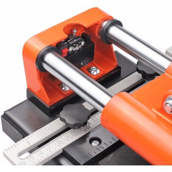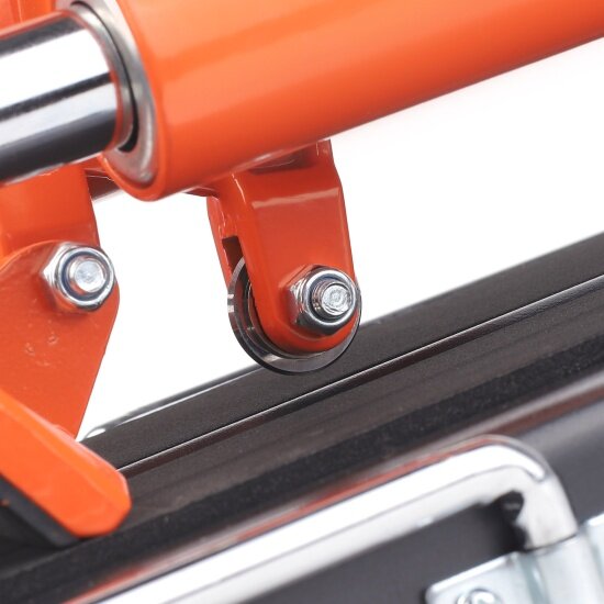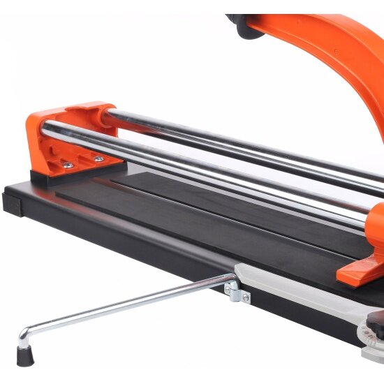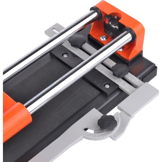 Рельсовый плиткорез с двумя направляющими подходит для обработки плитки из различных материалов. Рельсы-направляющие изготовлены из хромированной стали с антикоррозийным покрытием. Для работы с крупногабаритными заготовками предусмотрена боковая поддержка; возможно расширение рабочей поверхности. Конструкция рукоятки исключает защемление рук и гарантирует устойчивость при резке. На эргономичной изогнутой ручке сделаны специальные углубления для пальцев. Рукоятка удобно размещается в руке и не выскальзывает при работе. Ручка обеспечивает равномерное распределение давления. Модель имеет линейку-угольник для резки плитки под углом 30-45-60°, регулировки размера, дополнительной фиксации отрезаемой заготовки и точного положения плитки. Это позволяет выполнять точный рез вне зависимости от выбранного материала. Несущая каретка с подшипниками осуществляет плавный ход. Полное отсутствие люфта между кареткой и рельсом. Лазерный указатель реза эффективен в работе и гарантирует высокую точность. Литая станина из алюминиевого сплава с обрезиненной рабочей поверхностью.
