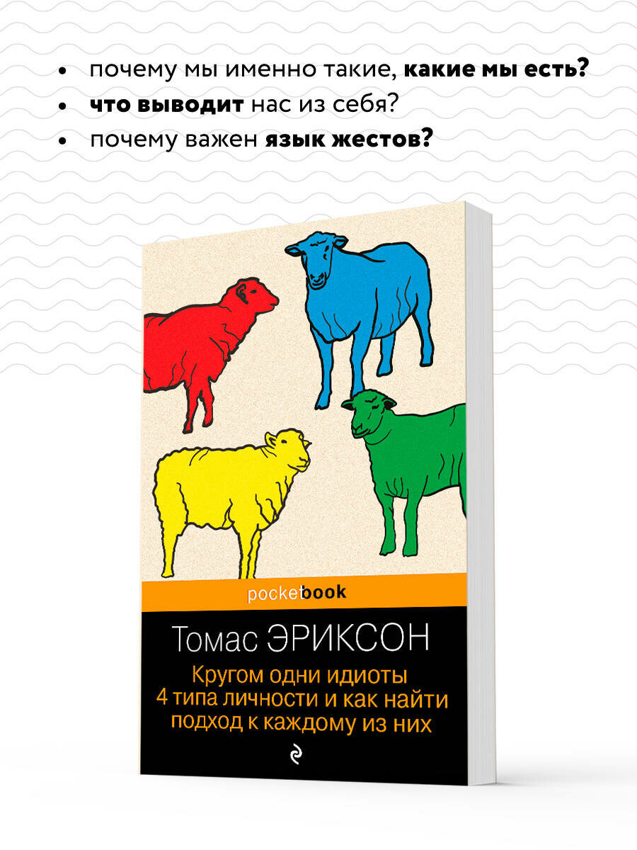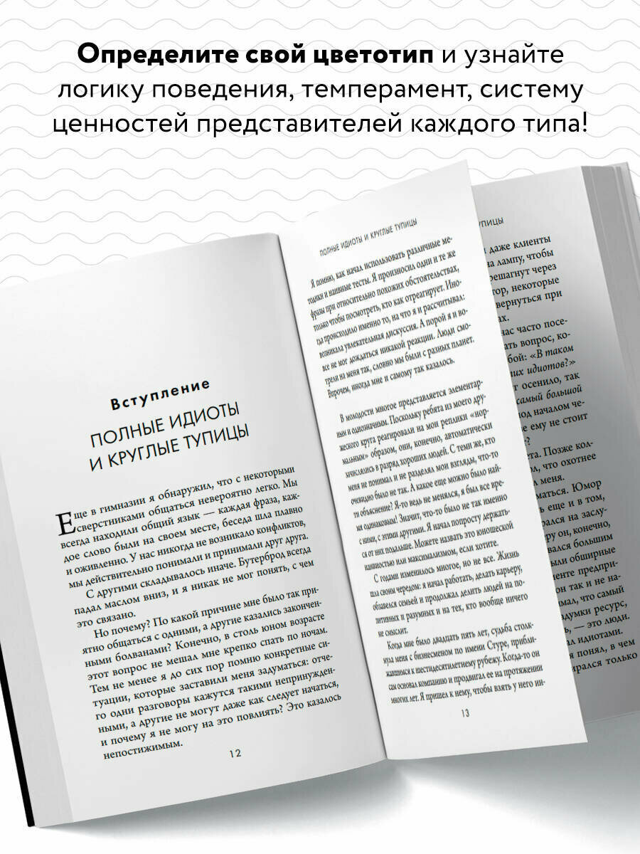 В основе книги лежит несложная методика цветотипирования человеческих характеров. Шведский психолог Томас Эриксон делит всех людей на четыре типа: красный, желтый, зеленый, синий — и очень увлекательно, на узнаваемых примерах описывает логику поведения, темперамент, систему ценностей представителей каждого типа. Казалось бы, ничего нового. Подобный подход использовался психологами на протяжении десятилетий. Но Томасу Эриксону удалось придумать настолько удобную систему работы с известными инструментами, что сегодня книга «Кругом одни идиоты» лежит на столе каждого шведского руководителя, учителя и журналиста.