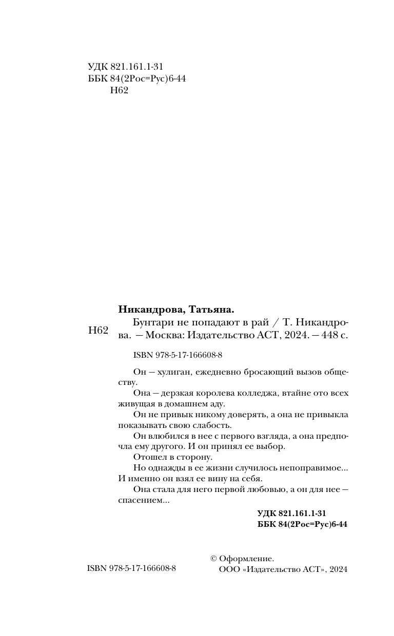 Бунтари не попадают в рай (Никандрова Татьяна Юрьевна); ИЗДАТЕЛЬСТВО "АСТ", 2024
