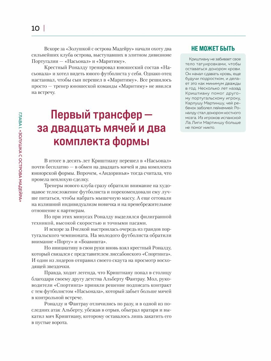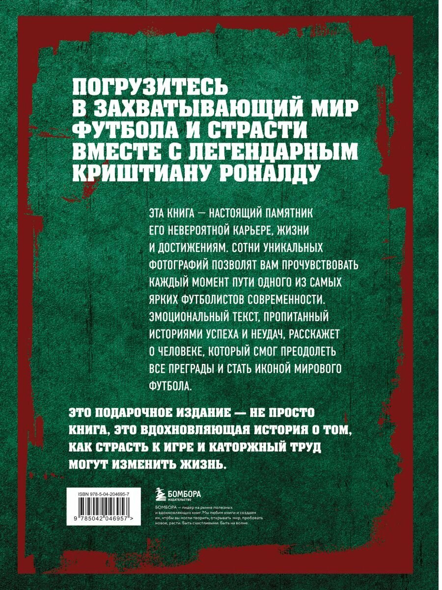 Эта книга — настоящий памятник его невероятной карьере, жизни и достижениям. Сотни уникальных фотографий позволят вам прочувствовать каждый момент пути одного из самых ярких футболистов современности. Эмоциональный текст, пропитанный историями успеха и неудач, расскажет о человеке, который смог перейти все границы и стать иконой мирового футбола. Это подарочное издание — не просто книга, это вдохновляющая история о том, как страсть к игре и каторжный труд может изменить жизнь.