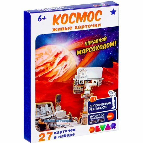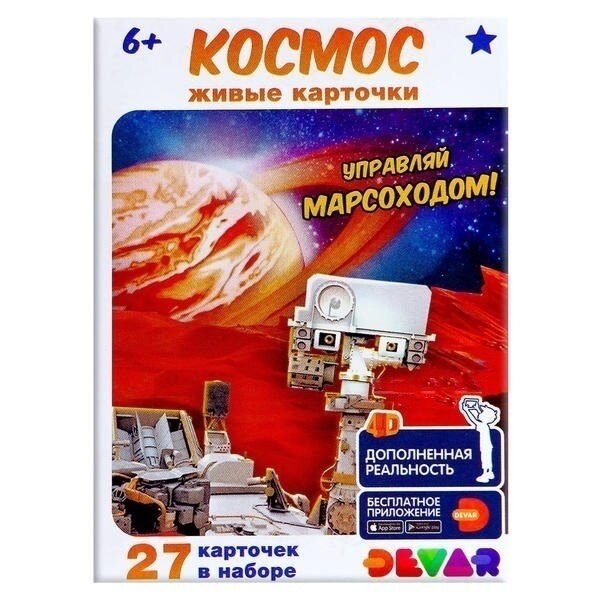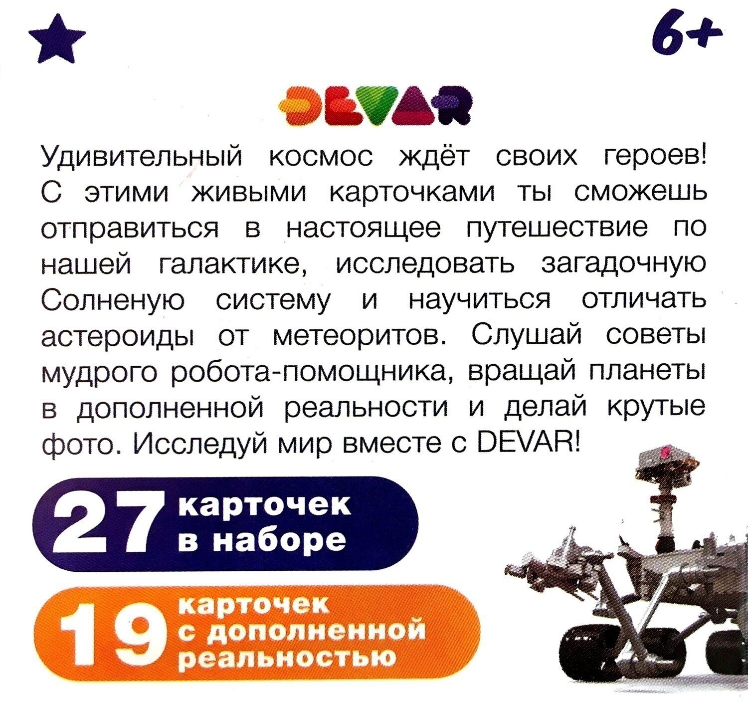 Удивительный космос ждёт своих героев! С этими живыми карточками ты сможешь отправиться в настоящее путешествие по нашей галактике, исследовать загадочную Солнечную систему и научиться отличать астероиды от метеоритов. Слушай советы мудрого робота-помощника, вращай планеты в дополненной реальности и делай крутые фото. Исследуй мир вместе с DEVAR! .27 карточек в наборе.