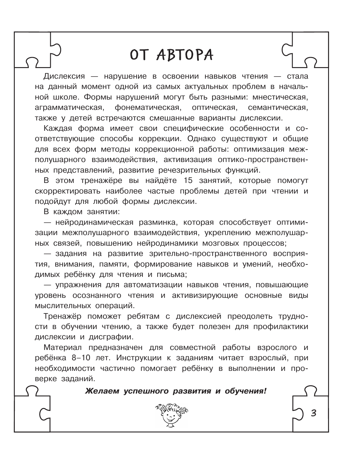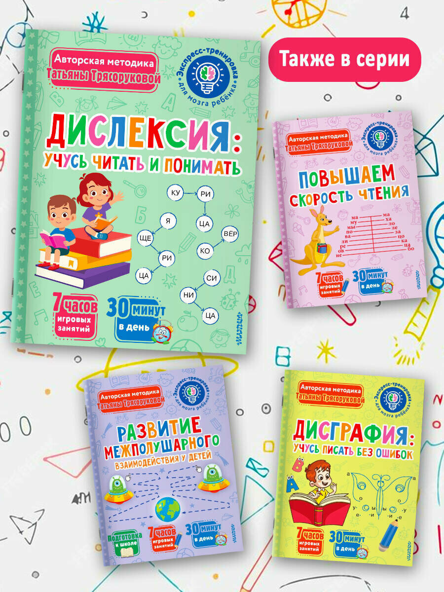Как помочь ребенку справиться с трудностями при чтении и письме? Как сделать его обучение в школе легким и успешным? Автор книги Татьяна Трясорукова, опытный психолог и педагог, автор программ, рекомендованных Федерацией психологов России, составила уникальную систему коррекционных игровых упражнений по преодолению и профилактике дислексии. Тренажер поможет ребенку научиться различать фонемы, запоминать зрительный образ букв, определять их сходство и различия и писать их без ошибок. Веселые картинки, интересные задания сделают занятия не только полезными, но и интересными. Книга поможет развить внимание и память, сформировать новые и укрепить уже имеющиеся межполушарные связи.