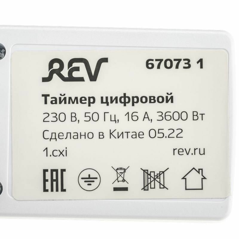Rev 67073 1 - электронный недельный таймер, который обеспечивает работу присоединенного к нему бытового электроприбора по заданному времени. Аппарат имеет 16 программ. Пользователь может легко создать расписание работы необходимого электроприбора с точностью до минуты на каждый день недели. Программа устанавливается один раз и будет повторяться до тех пор, пока не будет задана новая. Устройство оснащено встроенным аккумулятором.