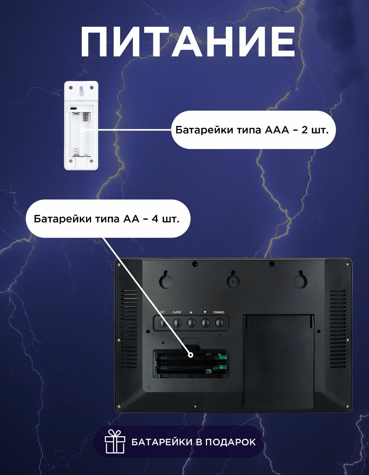 | Источник питания | метеостанция: батарейки типа АА, 1,5 В – 4 шт. (нет в комплекте), датчик: батарейки типа AAА – 2 шт. (нет в комплекте) |