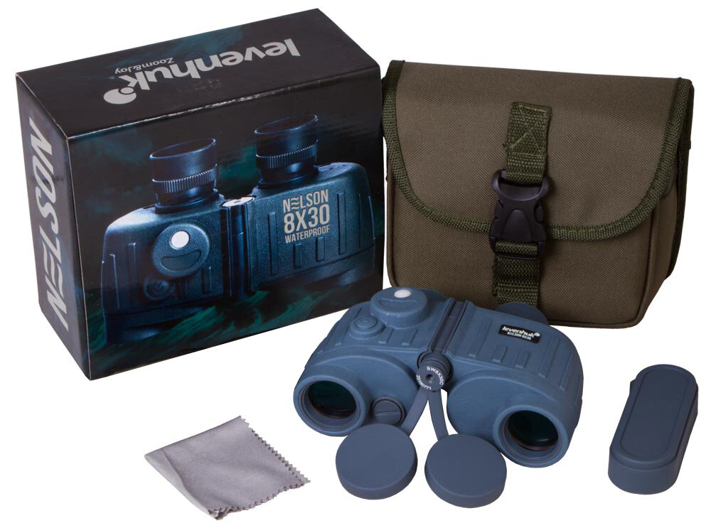 Морской бинокль Levenhuk Nelson 8x30 надежный оптический прибор для любителей водных прогулок и рыбалки. Это модель с водонепроницаемым корпусом и хорошими оптическими характеристиками. Бинокль дает 8-кратное увеличение, с его помощью можно детально рассмотреть удаленные объекты. Поле зрения составляет 139 м на расстоянии в 1000 м, это удобно для изучения горизонта одним взглядом вы сможете охватить большое пространство.Бинокль построен на призмах Porro. Оптика из высококачественного стекла BaK-4 сводит к минимуму оптические искажения. Для формирования четкой, яркой и детализированной картинки на элементы оптики нанесено полное многослойное просветление.Обрезиненный пластиковый корпус прочен и удобно лежит в руках. Азотное заполнение препятствует выпадению конденсата на линзах при резкой смене температуры. Бинокль Levenhuk Nelson 8x30 выполнен не только в герметичном, но и непотопляемом корпусе при попадании в воду оптический прибор не уйдет на глубину, а линзы и призмы не повредятся. Добавьте к биноклю яркий плавающий ремень Levenhuk FS10, и вы никогда его не потеряете!Можно вести наблюдения, не снимая очки складные наглазники окуляров позволяют настроить ширину поля зрения. Межзрачковое расстояние регулируется. Каждая оптическая труба фокусируется индивидуально, такое решение часто применяется при конструировании морских биноклей. Центральный механизм фокусировки отсутствует. Для длительных наблюдений удобно установить прибор на штатив на корпусе есть специальное крепление.Морской бинокль снабжен дополнительными встроенными приборами компасом и дальномером. Шкалы размещаются в окулярах, проводить измерения можно непосредственно во время наблюдения. Светодиодная подсветка компаса пригодится при слабом освещении. Компас показывает направление на объект, выраженное в градусах угла. Север находится на отметке 360°, юг 180°, восток 90° и запад 270°.Чтобы пользоваться дальномером, нужно знать либо размер (высоту) объекта, либо расстояние до него. Неизвестный параметр рассчитывается по специальной формуле, в которую подставляют показания дальномера.Особенности: Непотопляемый морской бинокль в герметичном корпусе (степень защиты IPX7) Азотное заполнение для защиты от конденсата Встроенные дальномер и компас с подсветкой Модель с призмами Porro из стекла BaK-4 с нанесением полного многослойного просветления Окуляры с диоптрийной коррекцией Широкое поле зрения Можно закрепить на штативеКомплектация: Бинокль Защитные крышки объективов и окуляров Ремень Чехол Салфетка для ухода за оптикой 2 батарейки типа LR44 Инструкция по эксплуатации и гарантийный талон