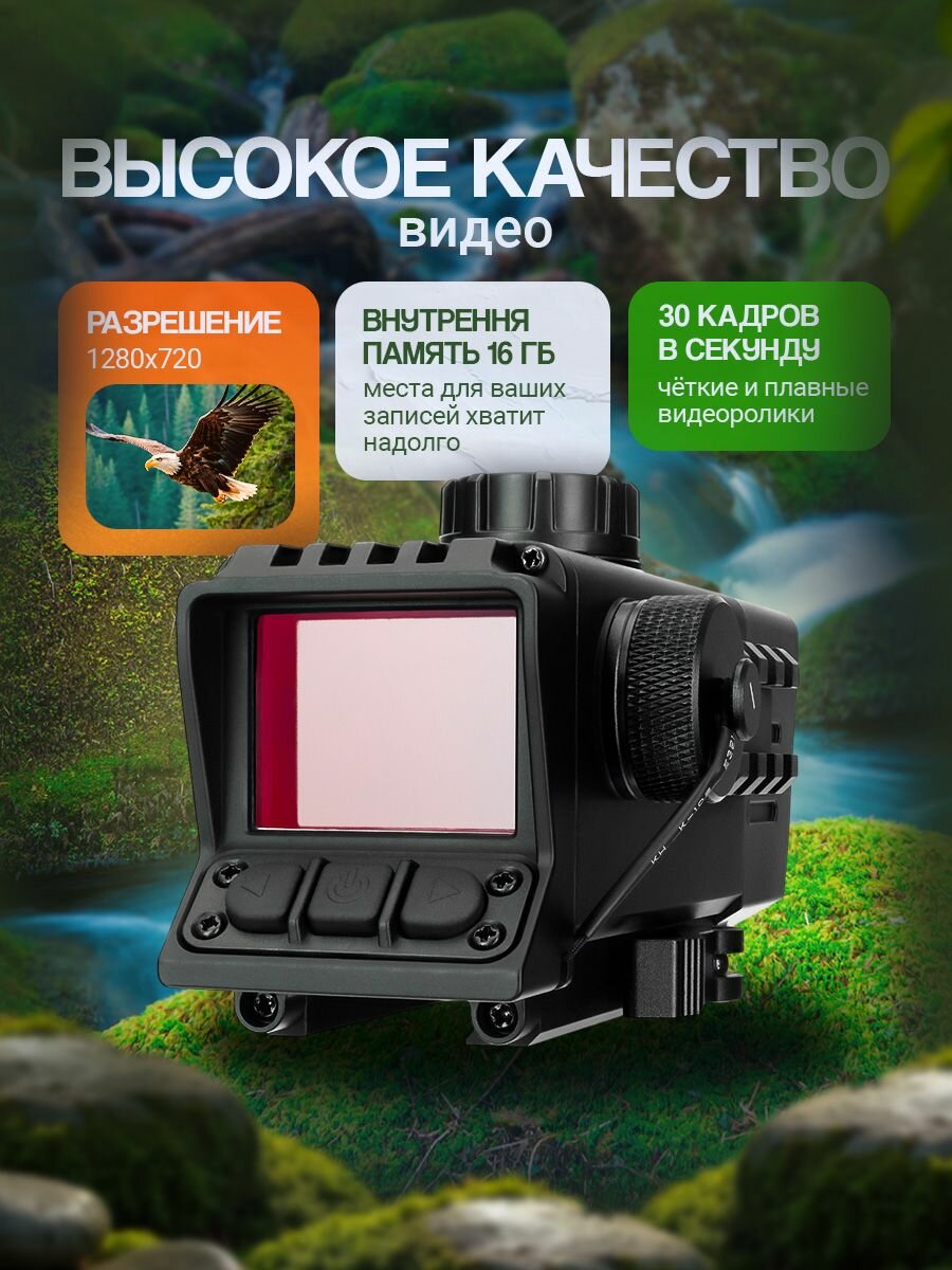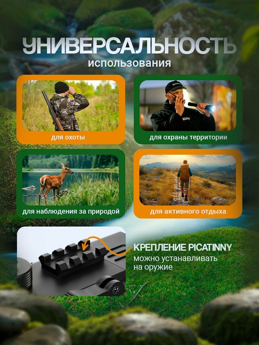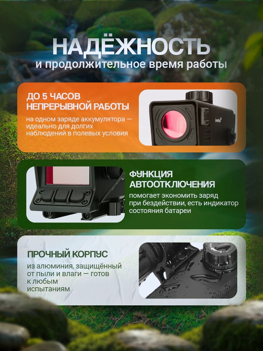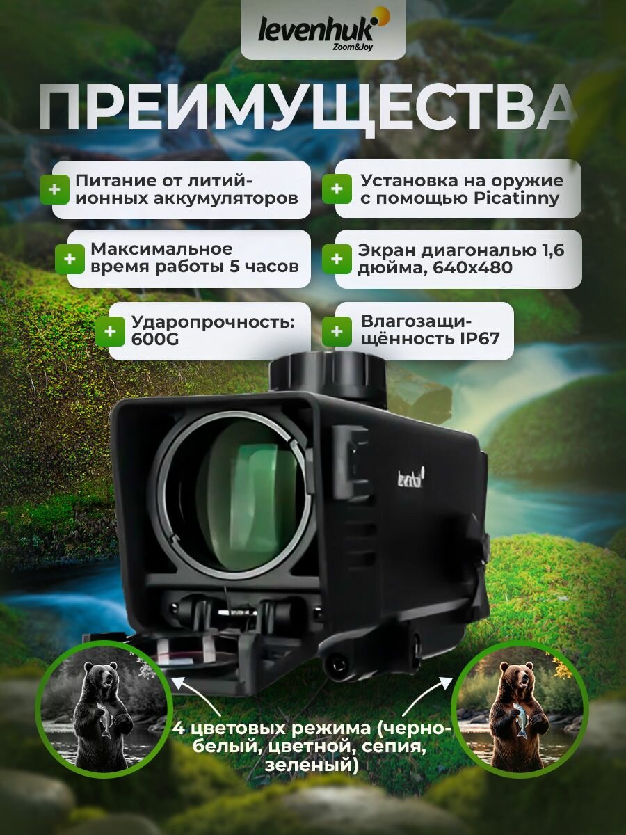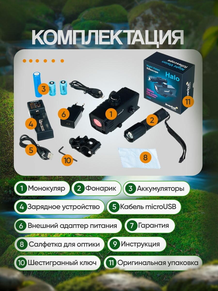 Levenhuk Halo NVR50 предназначен для ночной охоты. Благодаря чувствительному сенсору и ИК-подсветке он позволяет вести наблюдения и в полной темноте и сумерках с дальностью обзора до 300 метров. В дневное время его можно использовать как монокуляр с неограниченной дальностью обзора, оптическим и цифровым увеличением от 1х до 7х.Прибор устанавливается на гладкоствольное или нарезное оружие с помощью крепления Picatinny, инфракрасный фонарик устанавливается с помощью отдельного крепления (есть в комплекте). Функция автоматического вычисления баллистических данных помогает сделать точный выстрел.Алюминиевый корпус легкий и прочный, обладает уровнем влагозащищенности IP67. Это означает защиту от пыли, твердых частиц, брызг воды и даже кратковременного погружения в воду. Благодаря этому и способности работать при температурах от 40 °C до +55 °C Levenhuk Halo NVR50 можно использовать в любых погодных условиях, в любое время года.Прибор оснащен экраном, доступно 4 цветовых режима: флуоресцентный зеленый, сепия, черно-белый и цветной. Диагональ экрана 1,6", разрешение 640x480 пикс. Есть возможность записывать и воспроизводить видео в разрешении 1280х720 пикс. Видео записывается на внутреннюю память (16 ГБ), запись ведется в выбранном пользователем режиме: со звуком или без звука.Питание осуществляется от литий-ионных аккумуляторов (в комплект входят два аккумулятора емкостью 900 мАч и один емкостью 2200 мАч) с рабочим напряжением 3,7 В. Для перезарядки аккумуляторов в комплект входит универсальное зарядное устройство (подходит для аккумуляторов обоих типов). Возможна зарядка аккумуляторов непосредственно в устройстве его можно подключить к сети переменного тока, используя комплектные кабель microUSB и адаптер питания. Максимальное время работы 5 часов с выключенной ИК-подсветкой, с включенной до 3 часов. Автоматическое отключение через выбранное время позволяет эффективнее расходовать энергию.Обратите внимание: ИК-подсветка (излучение прибора) в процессе работы может быть заметна для фото-, видеокамер и подобных электронных устройств.