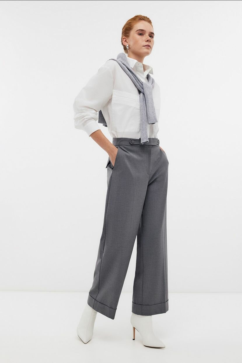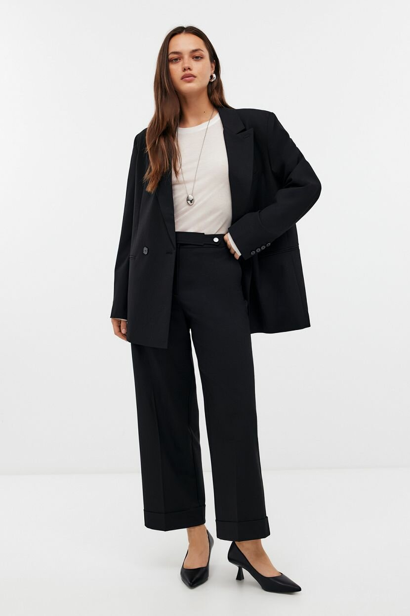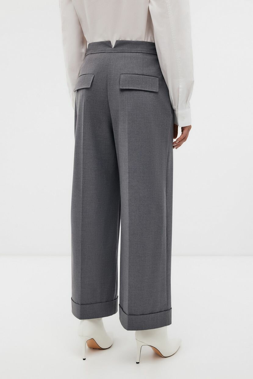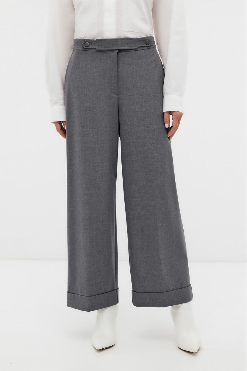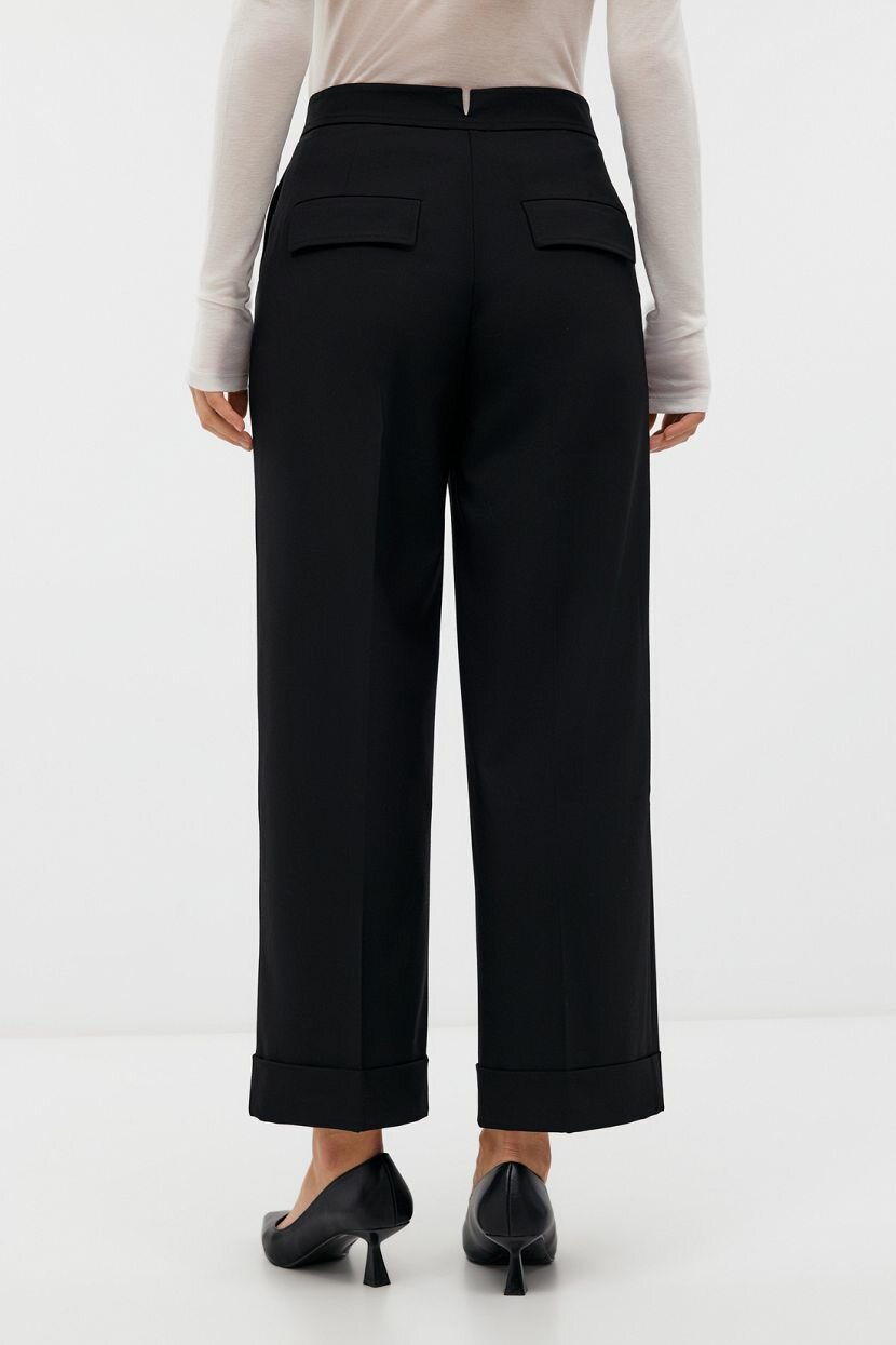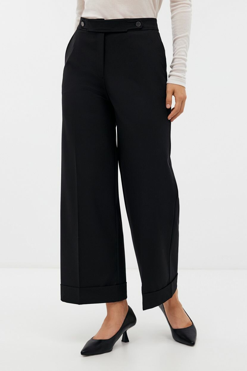 Широкие укороченные брюки со стрелками и манжетами по низу станут отличным дополнением гардероба. Модель изготовлена из поливискозной ткани с содержанием шерсти, что обеспечивает хороший внешний вид и комфорт. Карманы в боковых швах позволяют удобно разместить необходимые вещи, а фальшкарманы с клапанами придают стильный акцент сзади. Застежка на молнию, потайные крючки и пуговицу делает пояс надежным и удобным.Плотный материал сохраняет тепло, делая брюки подходящими для повседневного использования и походов в офис. Однотонный дизайн подчеркивает элегантность модели.Благодаря средней посадке на талии изделие идеально подчеркивает фигуру. Прямой крой создает стильный силуэт, который будет хорошо сочетаться с различными элементами гардероба. Материалы обеспечивают прочность и долгий срок службы брюк, позволяя наслаждаться их качеством долгое время.