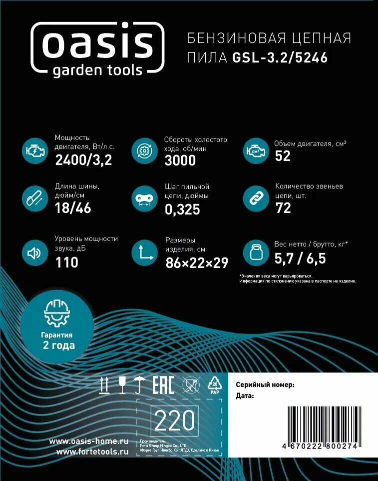 **Пила бензиновая Oasis GSL-3.2/5246** — удобное в эксплуатации и универсальное в использовании приспособление, которое пригодится как на дачном участке и в домашнем хозяйстве, так и в ремонтной деятельности. С помощью такого инструмента можно аккуратно и точно сучья в саду или материалы, выполненные из дерева. Цепь натягивается без больших сложностей — при помощи инструмента. Пила такого вида функционирует на двигателе внутреннего сгорания, с воздушным охлаждением. Отработанные газы выводятся через специальный глушитель. Удобная и нескользящая ручка улучшает контроль над бензиновой пилой. Антивибрационная система делает работу более комфортной, что особенно актуально при выполнении объемных задач.