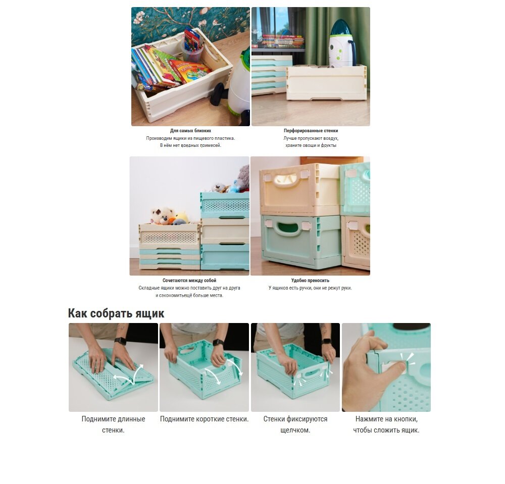 | Особенности | Многофункциональный складной ящик с перфорацией. Максимальная нагрузка -55кг. |