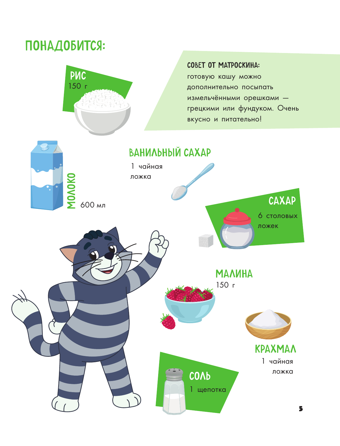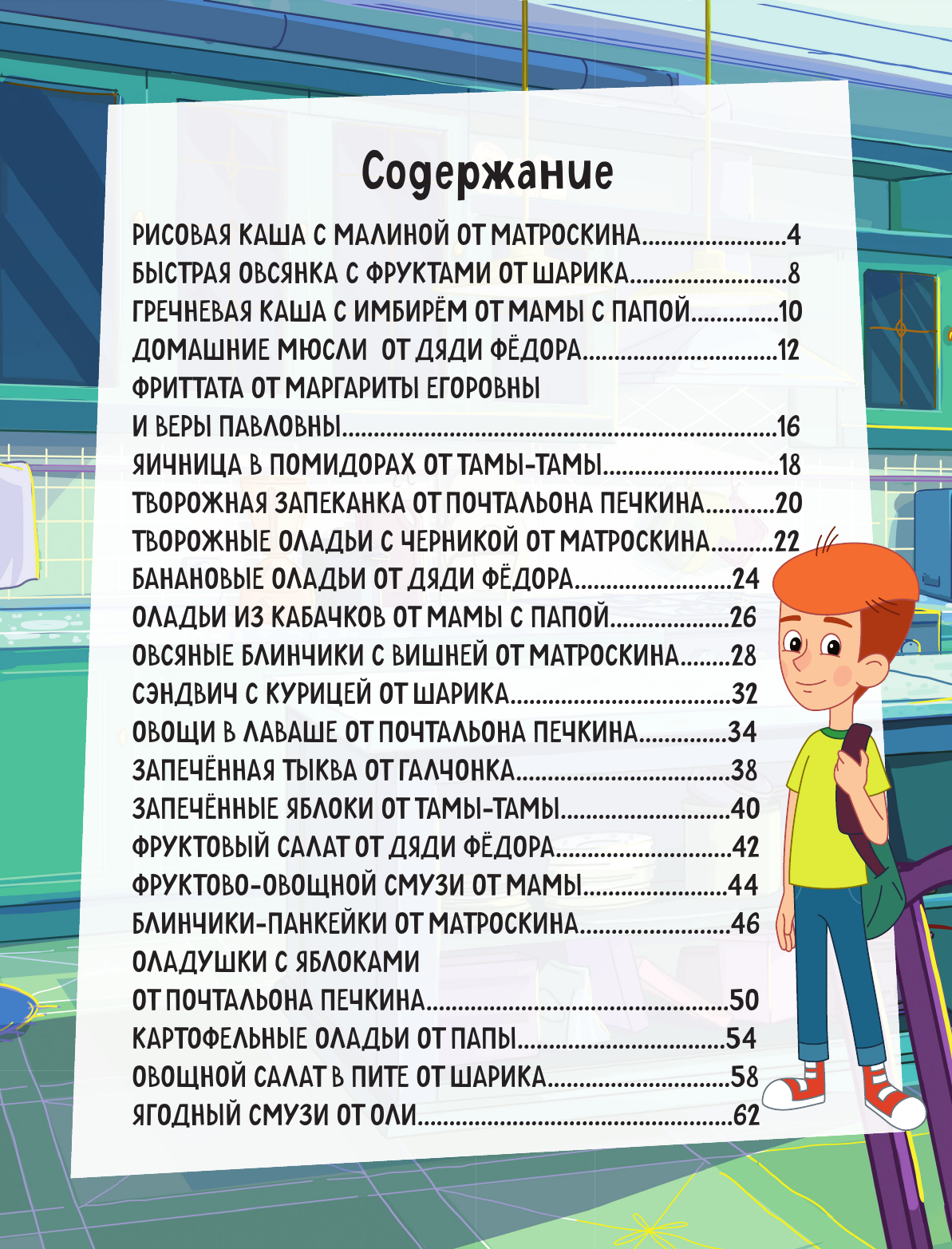 В книге ждут 22 проверенных рецепта, с которыми справится любой ребенок, а Матроскин, Шарик, Дядя Федор и другие герои будут помогать ему во время процесса.