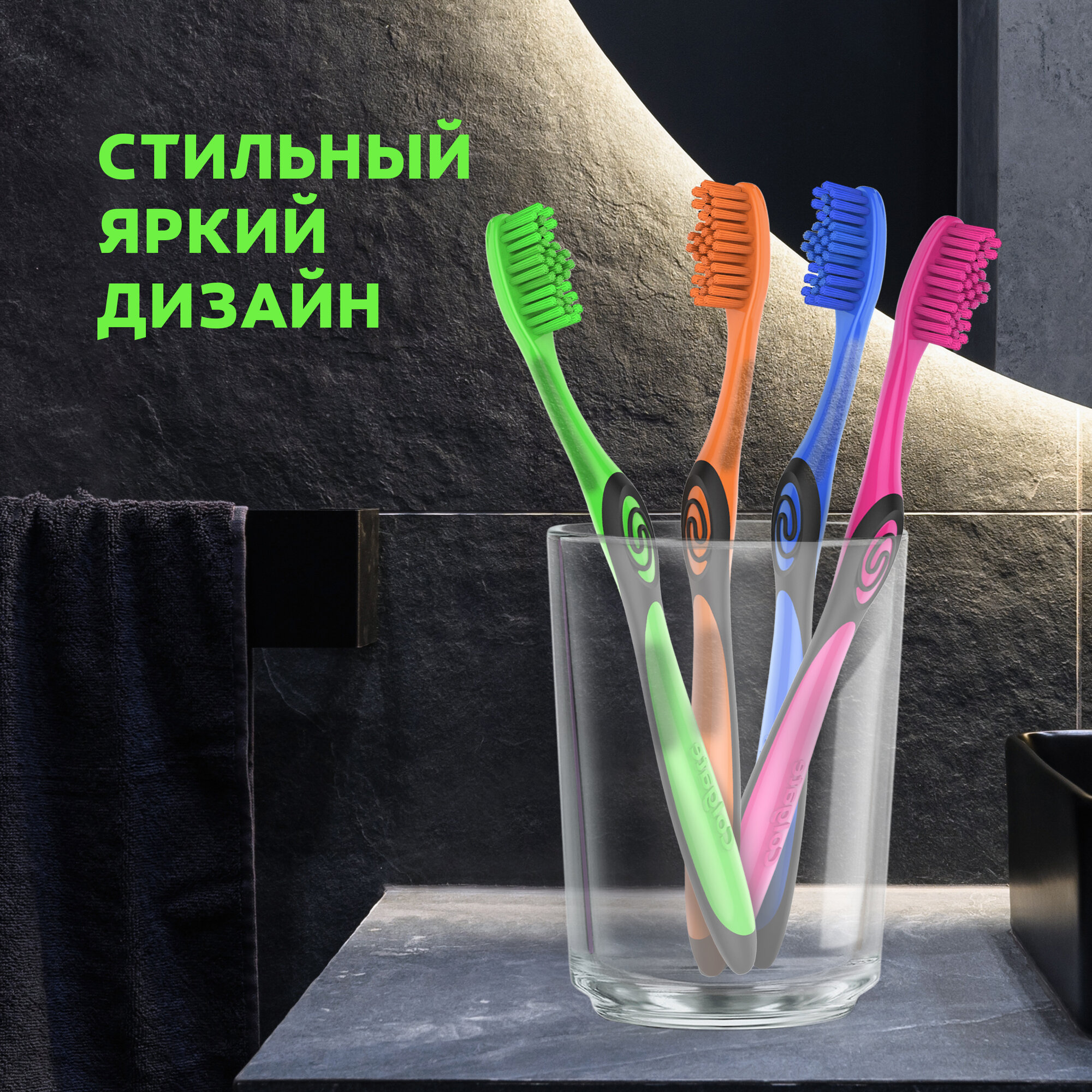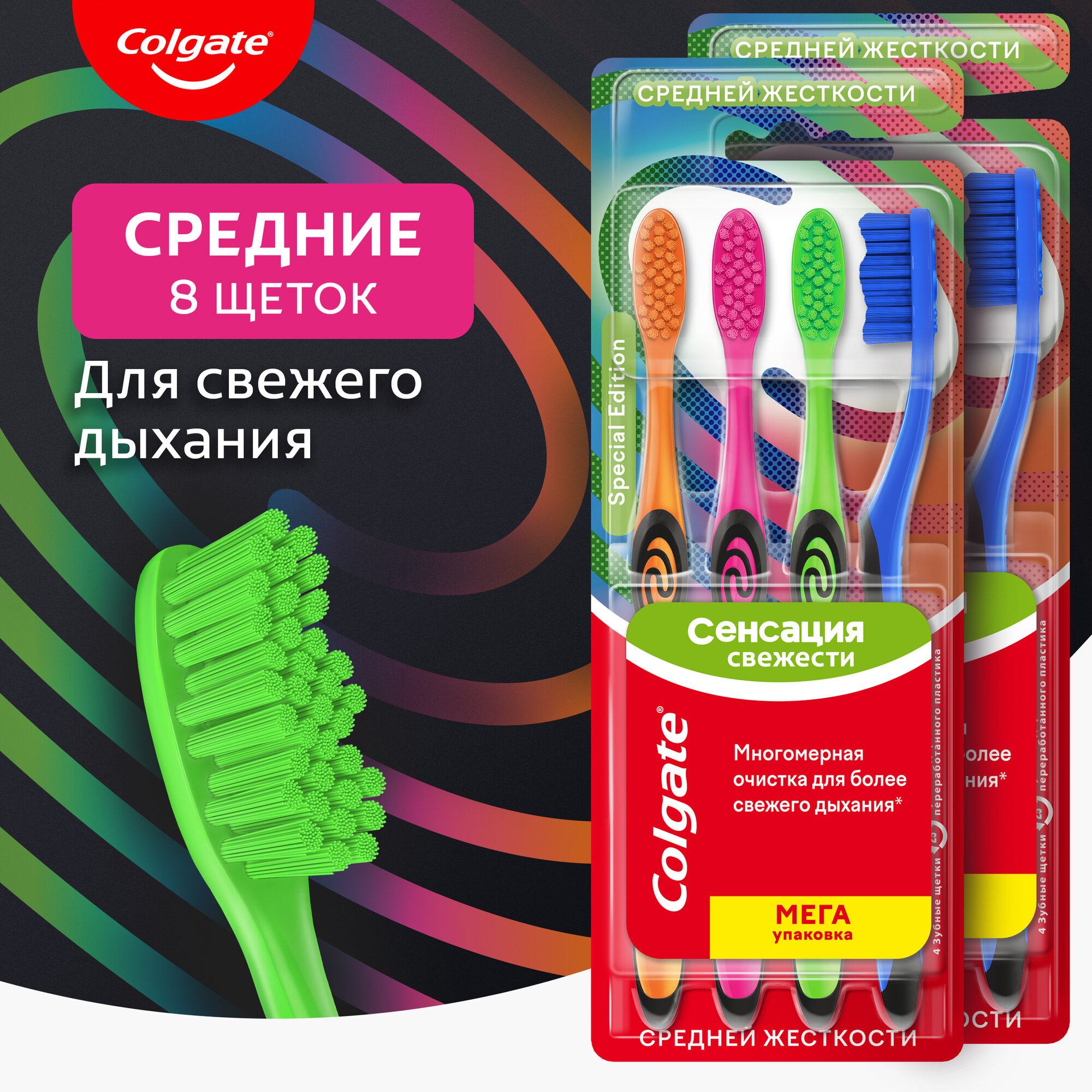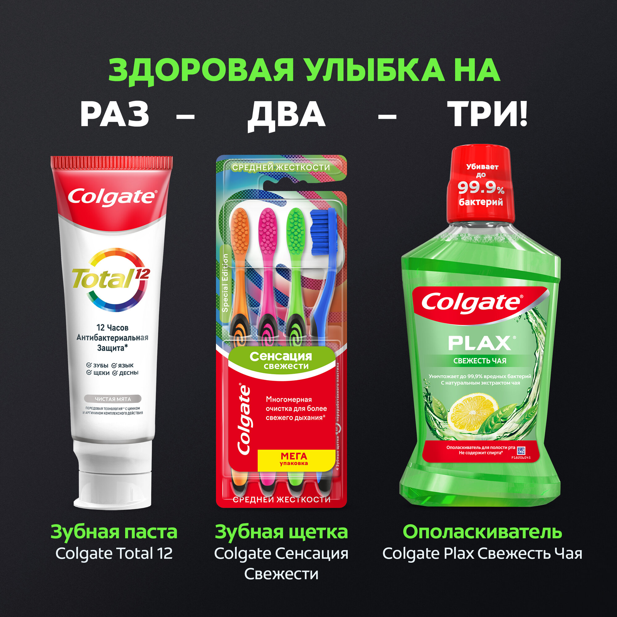 Зубная щетка Colgate Сенсация Свежести средней жесткости обеспечивает многомерную чистку для более свежего дыхания по сравнению с чисткой зубной щеткой с щетинками одинаковой высоты. Есть подушечка для чистки языка. В набор Colgate Сенсация Свежести входит 4 зубные щетки разных цветов для нескольких человек в семье.