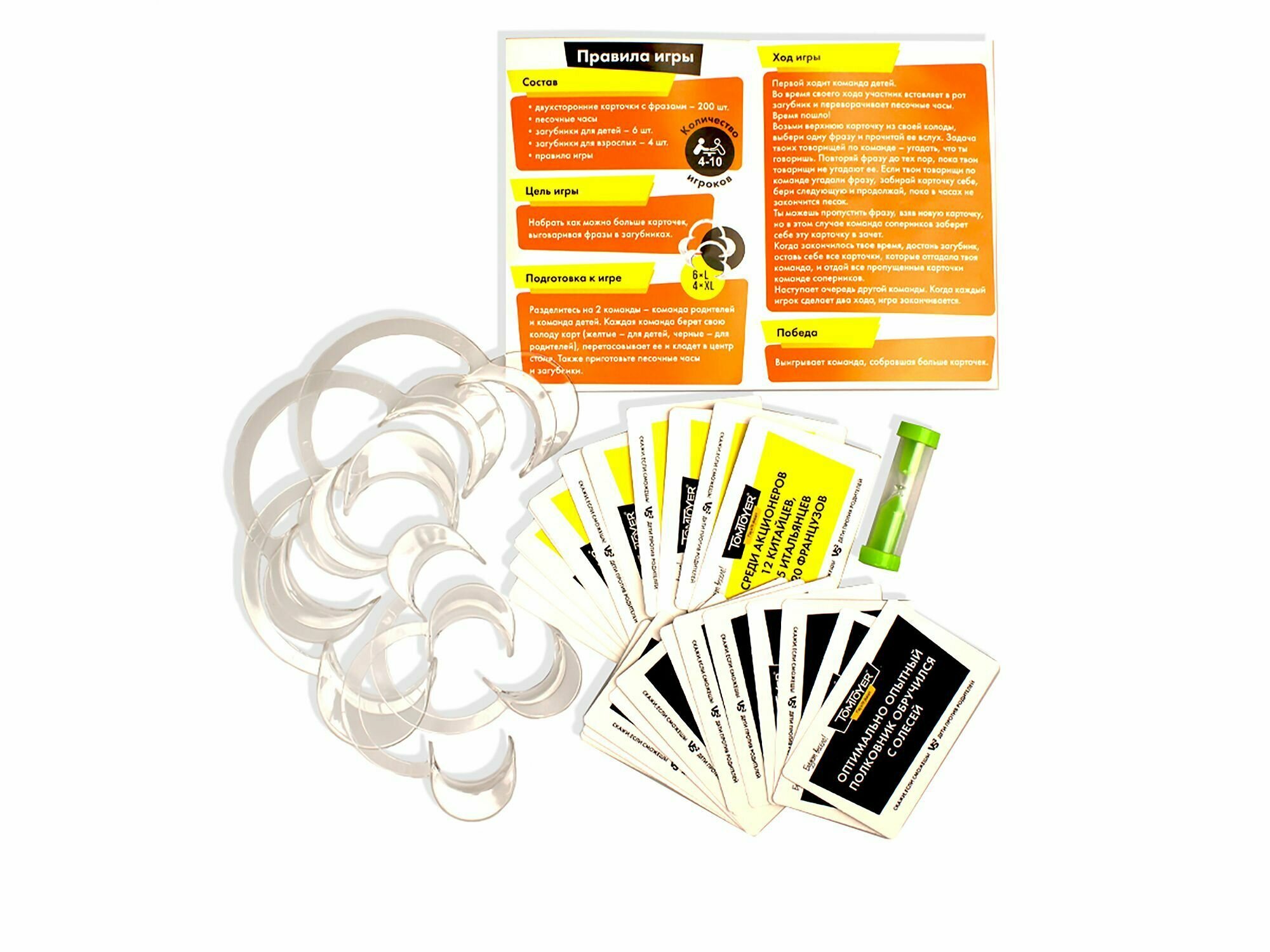 | Комплектация | 200 карточек с фразами, песочные часы, 6 загубников L размера, 4 загубника XL размера. |
