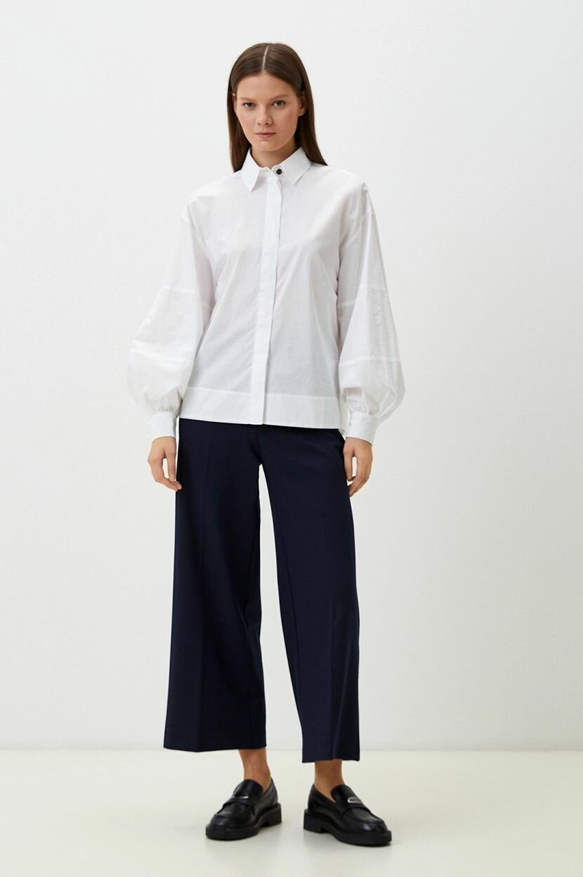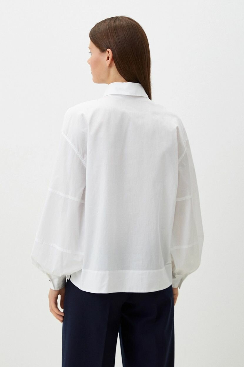 Расслабленный силуэт этой блузки обеспечит комфорт и стиль в любом образе. Изготовленная из натурального хлопка, она дарит ощущение свежести и легкости, идеальна для повседневной носки. Отложной воротник на стойке дополнен декоративной пуговицей для оригинальности. Супатная застежка на пуговицы выполнена в тон ткани, что создает гармоничный вид.Накладной карман добавляет функциональности и акцентирует внимание на дизайне изделия. Приспущенная линия плеча придает модели современный вид, а объемные рукава с манжетами на пуговицах создают элегантный силуэт. Спущенный длинный рукав идеально подходит для создания образов в офисном стиле или на каждый день.Низ изделия ровный с широким подгибом, что обеспечивает аккуратный край и удобство посадки. Столь продуманные детали делают эту вещь универсальной, подходящей как для деловых встреч, так и для неформальных мероприятий. Материал свободно пропускает воздух, благодаря чему блузка остается комфортной даже при длительной носке.