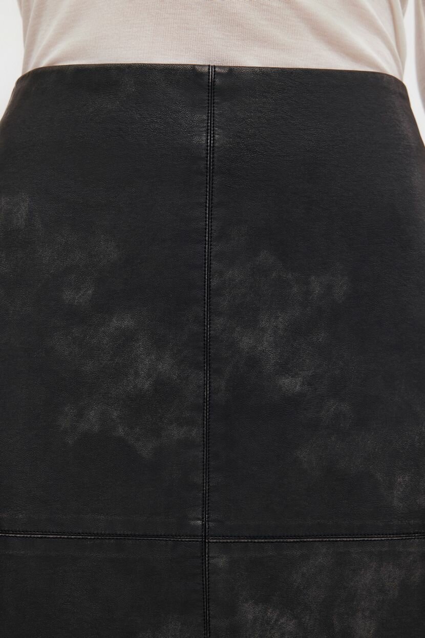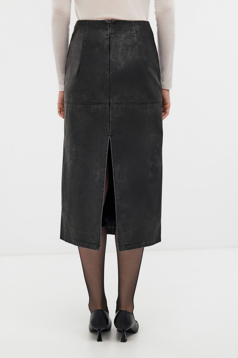 Юбка миди - классический must have женского гардероба, который сохраняет актуальность вне времени. Станет основой стильных образов для офиса и повседневных аутфитов. Ее легко интегрировать в луки благодаря лаконичному дизайну и универсальной длине. Прямой силуэт визуально вытягивает фигуру и нивелирует недостатки. Отрезной пояс выделяет линию талии. Вытачки придают утонченность и подчеркивают плавность изгибов. Сзади расположена застежка-молния. Шлица в среднем шве обеспечивает удобство при ходьбе. Модель выполнена из плотной тактильно приятной экокожи с винтажным эффектом. Декоративные потертости выглядят эффектно. Материал устойчив к выгоранию и деформации, поэтому изделие долгое время радует презентабельным внешним видом. Подкладка дарит тактильный комфорт и идеальную посадку.