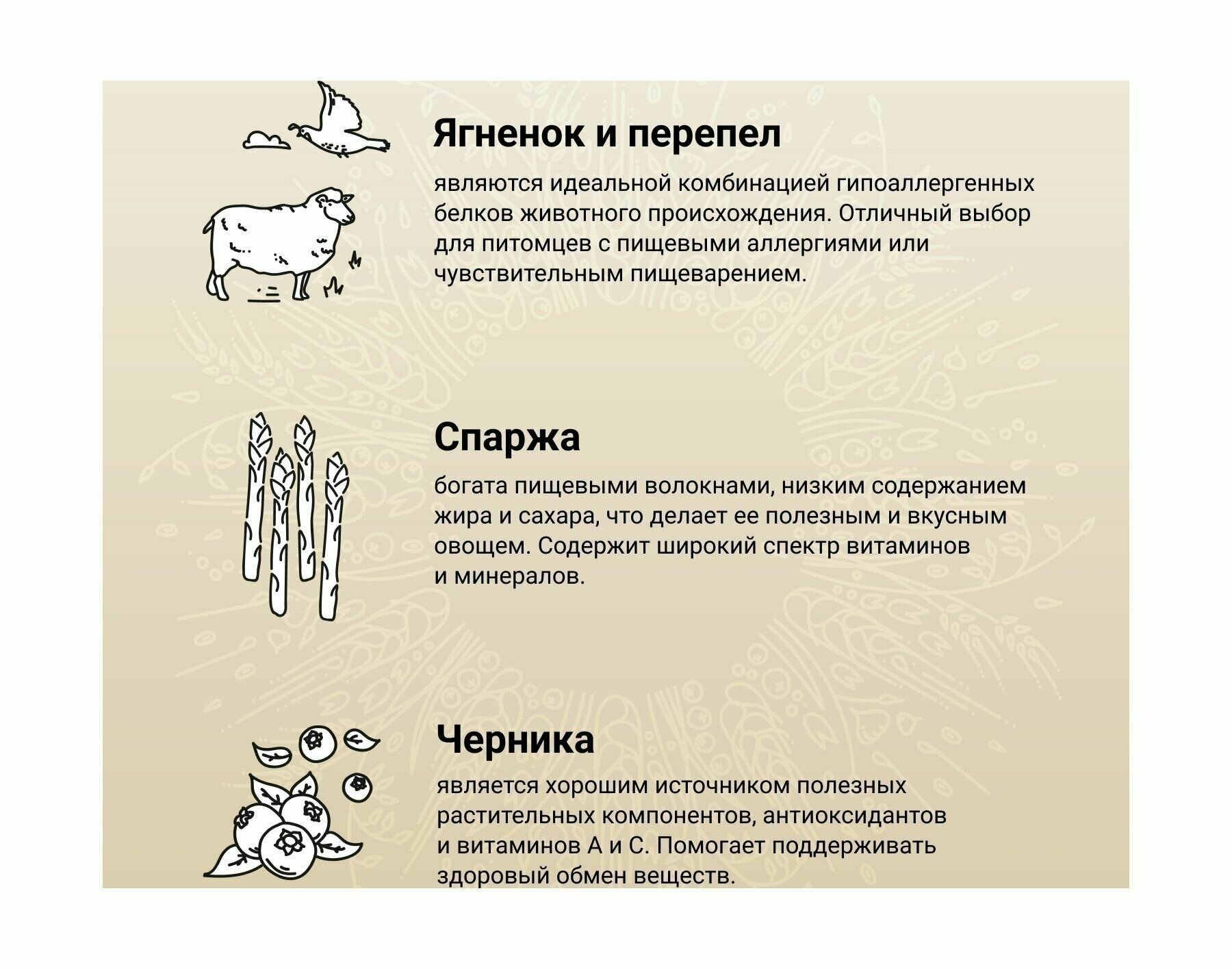 | Состав | Сырой ягненок (27%), сырой перепел (8%), дегидратированный белок ягненка (8%), куриный жир, дегидратированный перепелиный белок (5%), дегидратированный куриный белок, рыбий жир (лососевый), спельта, бурый рис, ячмень, овес, просо, гидролизованные белки птицы (курица, индейка), гидролизованный рыбий белок (треска, пикша), куриные потроха (печень, сердце, почки), сухое яйцо (куриное), льняное семя, сухая свекольная пульпа, люцерновая мука, волокна гороха, сушеная спаржа (0,5%), сушеная черника (0,5%), сушеная клюква, сушеная ацерола, инулин цикория (0,4%), дрожжевой экстракт (источник маннанoлигосахаридов) (0,3%), фруктоолигосахариды (0,3%), аскофиллум узловатый (Ascophyllum Nodosum), карбонат кальция, монокальцийфосфат, хлорид калия, хлорид натрия, сухие пивные дрожжи, глюкозамин, хондроитина сульфат, алоэ вера, розмарин, куркума, календула, семена и шелуха подорожника, юкка Шидигера. |