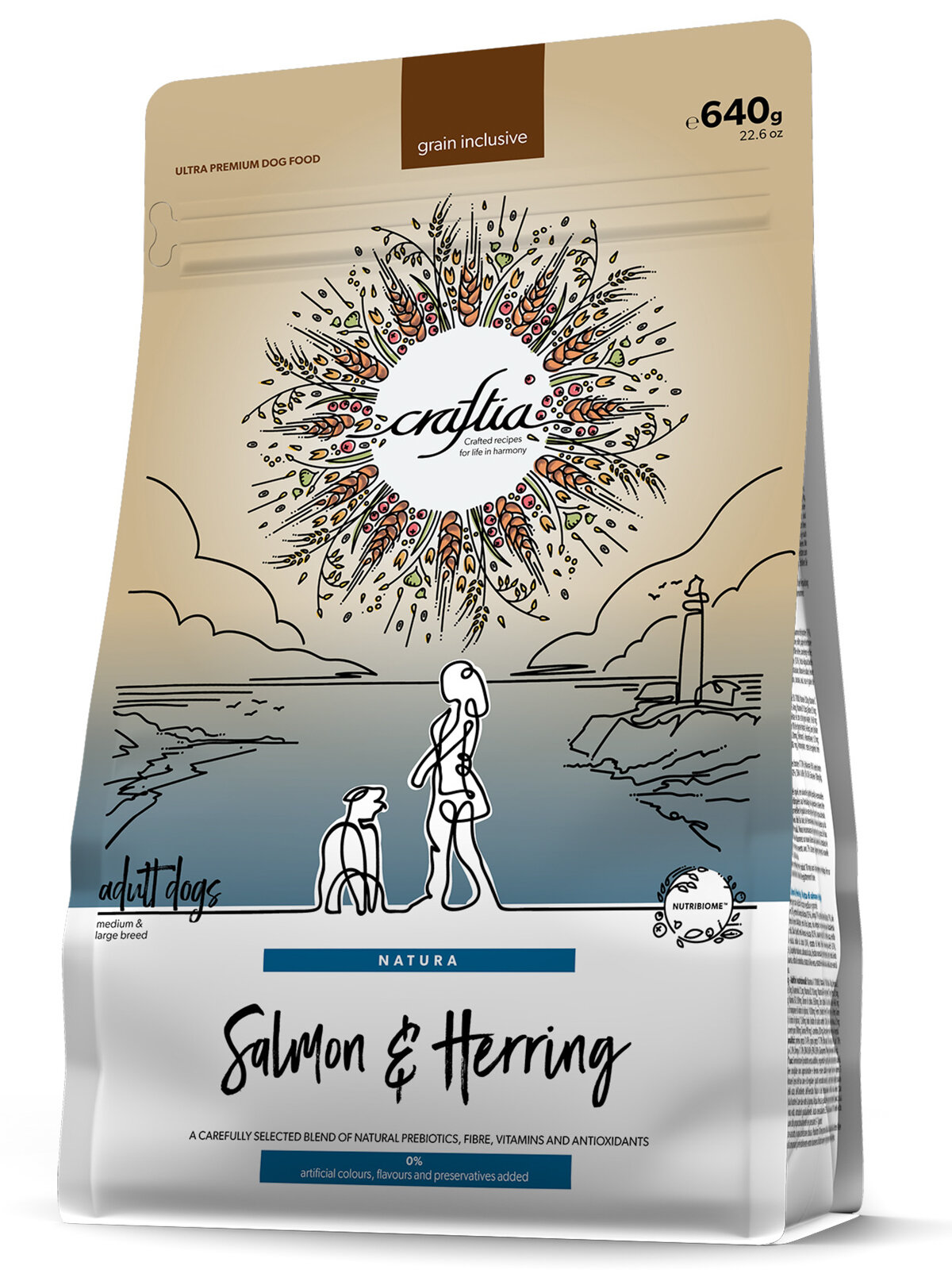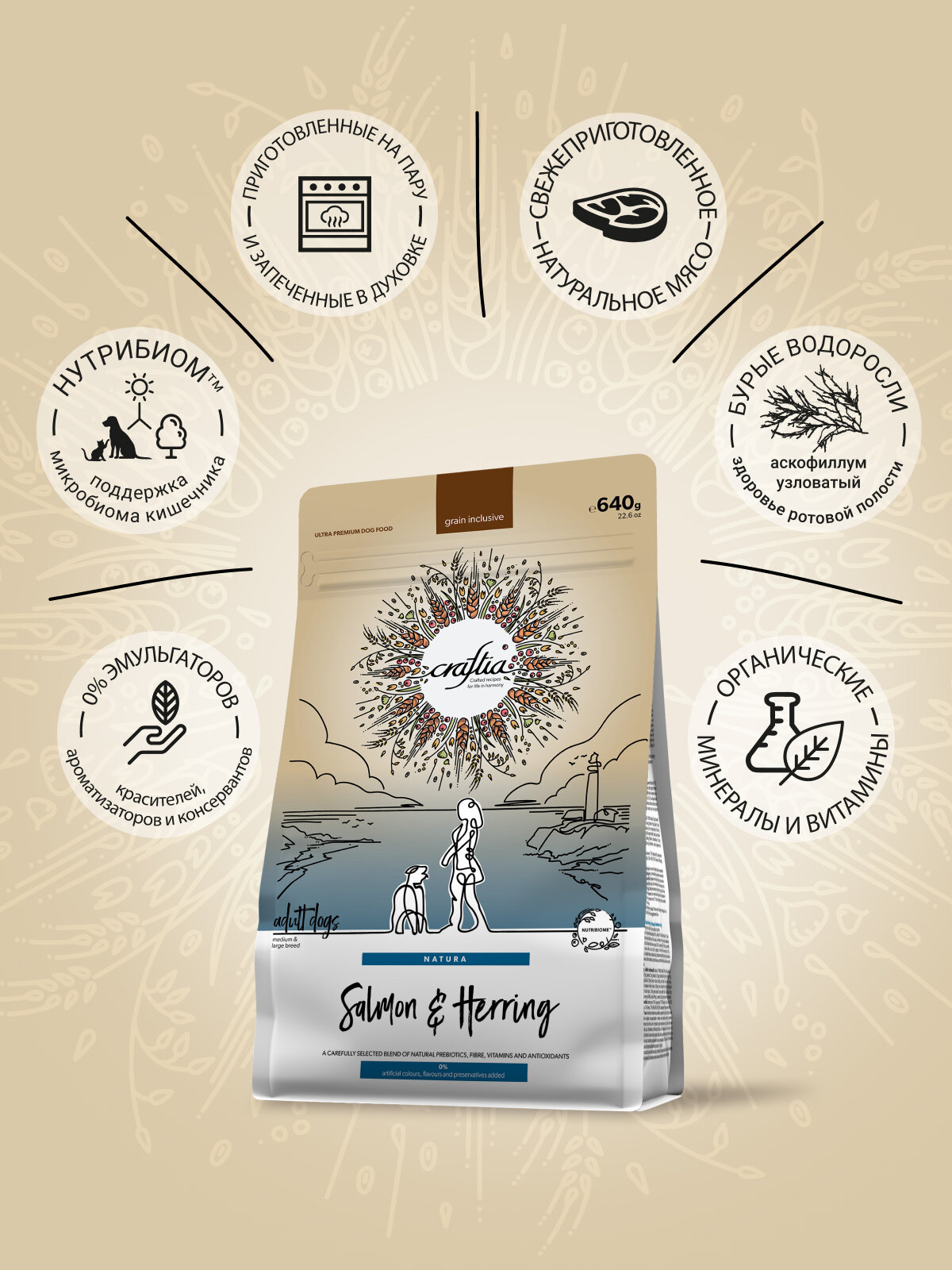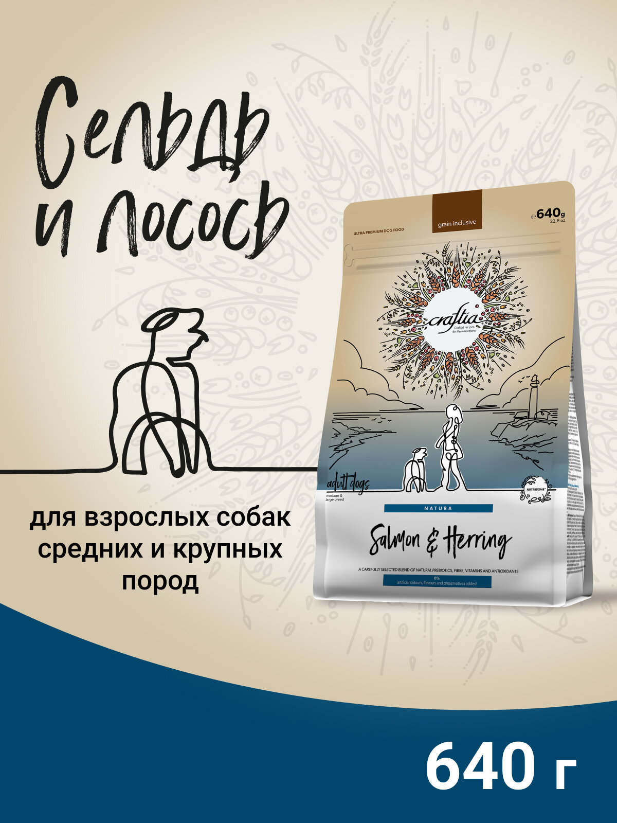 Сухой корм полнорационный для собак Craftia Natura для средних и крупных пород из лосося и сельди 640 г Crafita