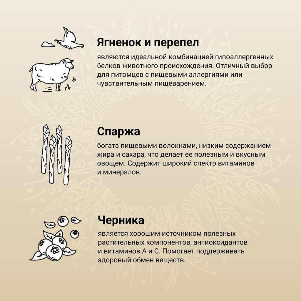| Состав | Сырой ягненок (27%), сырой перепел (8%), дегидратированный белок ягненка (8%), куриный жир, дегидратированный перепелиный белок (5%), дегидратированный куриный белок, рыбий жир (лососевый), спельта, бурый рис, ячмень, овес, просо, гидролизованные белки птицы (курица, индейка), гидролизованный рыбий белок (треска, пикша), куриные потроха (печень, сердце, почки), сухое яйцо (куриное), льняное семя, сухая свекольная пульпа, люцерновая мука, волокна гороха, сушеная спаржа (0,5%), сушеная черника (0,5%), сушеная клюква, сушеная ацерола, инулин цикория (0,4%), дрожжевой экстракт (источник маннанолигосахаридов) (0,3%), фруктоолигосахариды (0,3%), аскофиллум узловатый (Ascophyllum Nodosum), карбонат кальция, монокальцийфосфат, хлорид калия, хлорид натрия, сухие пивные дрожжи, глюкозамин, хондроитина сульфат, алоэ вера, розмарин, куркума, календула, семена и шелуха подорожника, юкка Шидигера. |