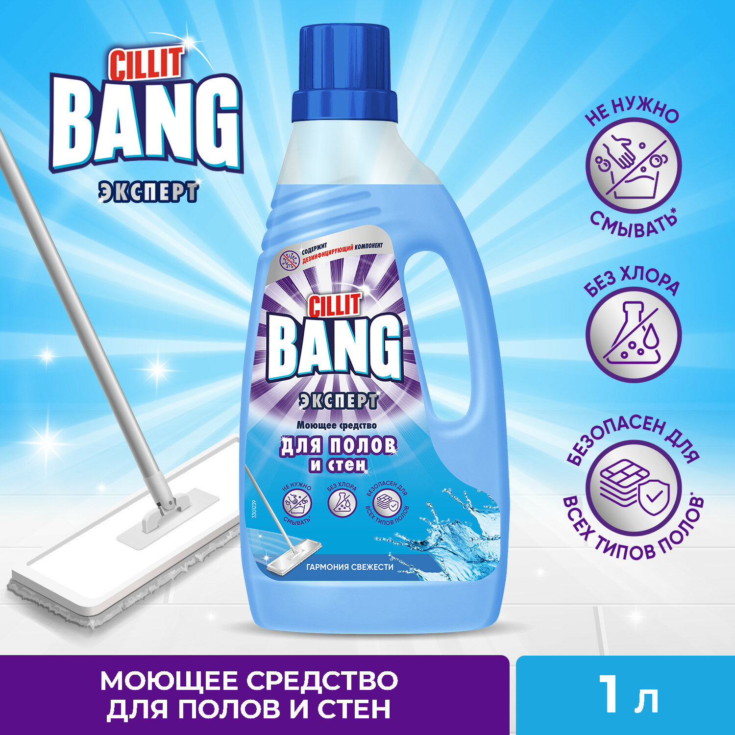 Средство для пола и стен Cillit Bang Гармония свежести подходит для очистки и дезинфекции всех видов полов и стен, легко растворяется в воде и не требует смывания. Оно обеспечивает блеск без разводов и подходит для использования в холодной воде. Состав не содержит хлора, а после уборки остаётся свежий и приятный аромат.