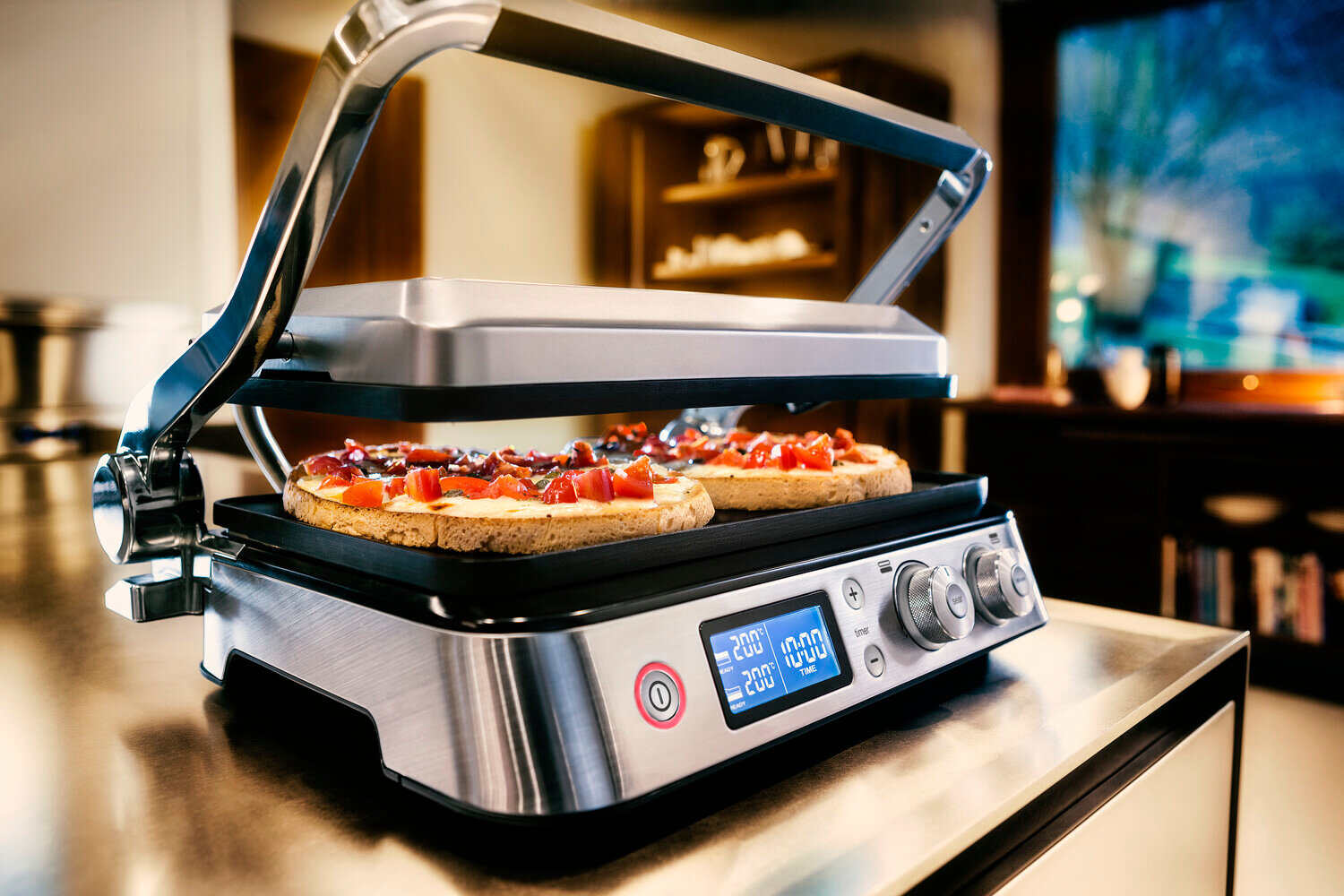 Электрогриль Braun позволяет приготовить любые продукты: стейки, колбаски, гамбургеры, овощи или рыбу. Использование прибора простое и понятное: вся необходимая информация указана на дисплее. Эта модель работает в трех режимах: контактный гриль (с закрытой крышкой), открытая жаровня (крышка откинута) и «гриль-печь» (верхняя панель приподнята над нижней). Температура нагрева задается в диапазоне от 60 до 230 градусов отдельно для каждой поверхности при помощи поворотных регуляторов. Прибор оповестит о готовности к работе звуковым сигналом – пора приступать к закладке продуктов! Электрогриль оснащен нагревательными элементами с двух сторон, что обеспечивает равномерную прожарку блюд и румяную корочку. Наклон крышки можно регулировать. Корпус гриля выполнен из нержавеющей стали и термопластичного пластика — прибор сохраняет свой внешний вид даже при интенсивном использовании, легко очищается. Ручки не нагреваются. Съемные панели с антипригарным покрытием, их разрешено мыть в посудомоечной машине, изделия устойчивы к царапинам и деформации. В комплекте две рифленые и две гладкие панели , лопатка для очищения, а также емкость для сбора стекающего жира. Компактный прибор не занимает много места.