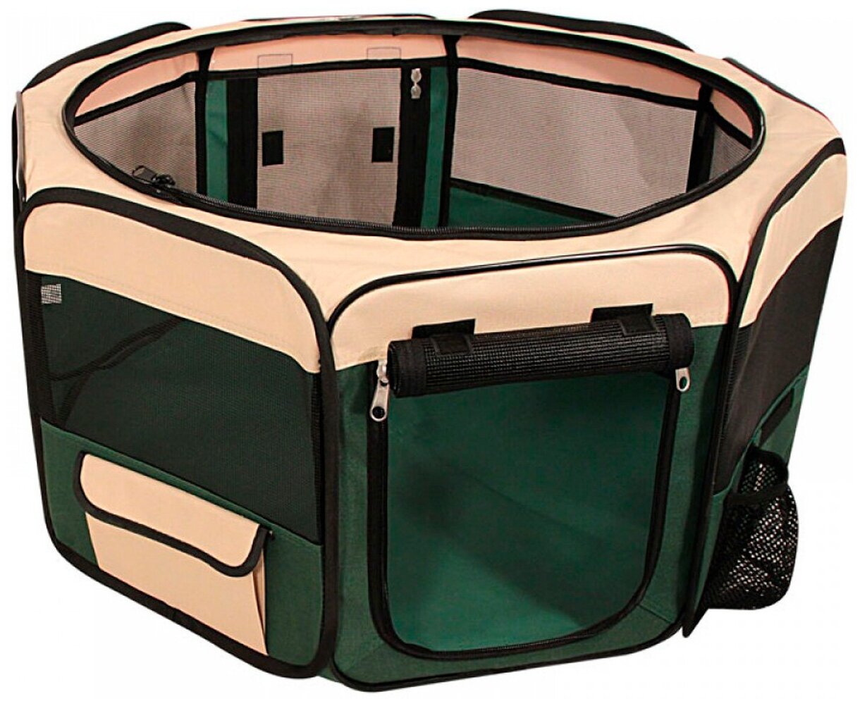Идеально подойдет для использования в квартире. Вольер изготовлен из экологичного синтетического материала. Внутрь вшита металлическая конструкция, которая в разложенном виде крепко натягивает ткань.Швы аккуратные, металлическая конструкция находится внутри, вольер абсолютно безопасный даже для самых маленьких питомцев.Съемная крыша из нейлоновой плотной прорезиненной сетки обеспечивает свободный доступ кислорода, крепится по диаметру крыши вольера с помощью молнии.Дно из непромокаемого материала крепится к вольеру при помощи липучек.Запатентованная конструкция дает возможность легко и быстро собрать вольер. Не требует сборки.В сложенном виде вольер очень компактный и плоский, убирается в удобную сумку с ручками, которая идет в комплекте.Ткань очень прочная и износостойкая. Тем не менее, не рекомендуется оставлять щенков и собак в вольере надолго без присмотра, особенно если животное очень любит грызть вещи. При первом использовании рекомендуем обработать вольер любым антигрызином, чтобы не давать собаке повода начать грызть его.Материал: 100% полиэстер, металл.