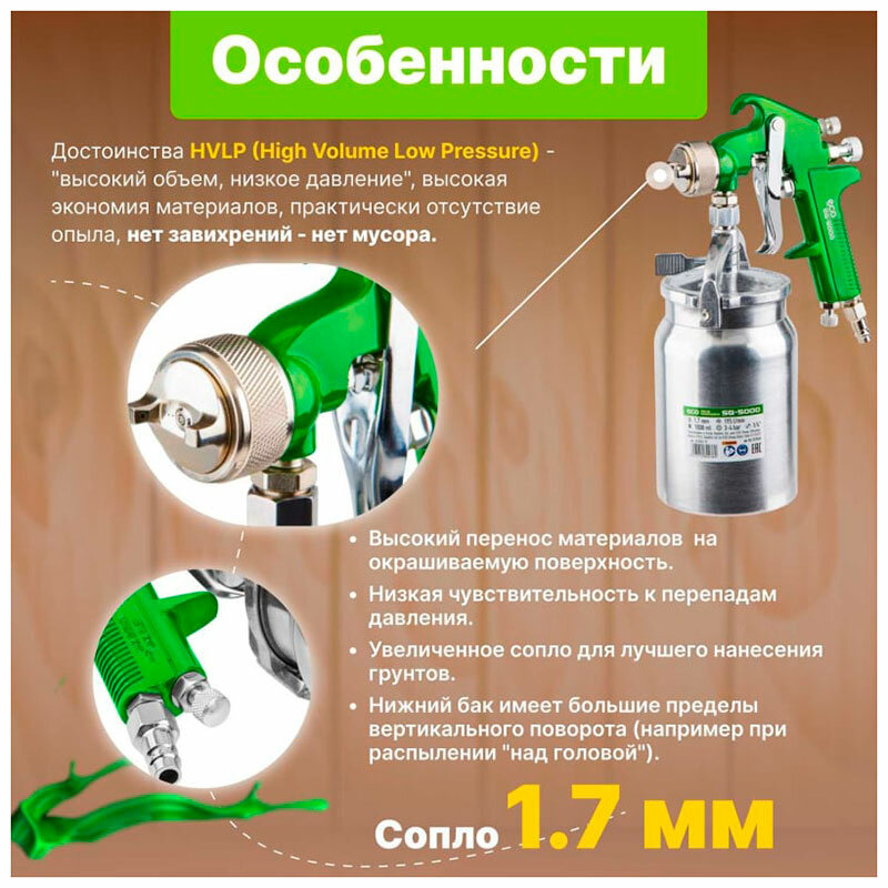 Краскораспылитель ECO SG-5000 - это компактный и легкий краскораспылитель для нанесения лакокрасочных материалов на небольшие поверхности. Нанесение покрытия происходит по технологии HVLP. Краскопульты с технологией HVLP отличаются пониженным туманообразованием и низкими потерями ЛКМ. Преимущества Технология HVLP (High Volume Low Pressure - "высокий объем, низкое давление") позволяет экономить материал Высокий процент переноса материалов на окрашиваемую поверхность Низкая чувствительность к перепадам давления Увеличенное сопло для лучшего нанесения грунтов Вместительный бак для краски Регулировка формы факела Потребление воздуха 230 - 270 л/мин Подключение: резьбовое 1/4" + быстросъемное соединение
