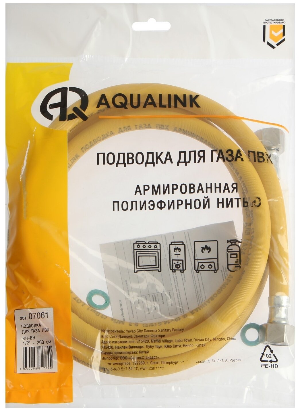 Подводка для газа ПВХ AQUALINK предназначена для подсоединения газового оборудования к источнику газоснабжения.Преимущества Шланг подводки выполнен из ПВХ и армирован полиэфирной нитью, гайки и штуцеры выполнены из сплава, предназначенного для работы в газовых средах (ЧНЗХМДШ с никелевым покрытием) Благодаря высокой эластичности подводки обеспечивается удобство монтажа изделия Подводка комплектуется паронитовыми уплотнительными кольцами Допускается эксплуатация подводки в рекомендованном диапазоне рабочих температур от -10 до +70 °С