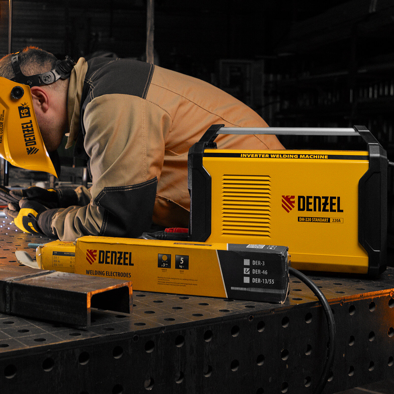 Инверторный аппарат дуговой сварки Denzel DM-220 Standart 94326 имеет продолжительность включения 60% и работает с со сварочным током до 220 А. Сварочные провода с увеличенным до 25 кв. мм сечением позволяют избежать потерь тока и не нагреваются во время работы с максимальной нагрузкой. Аппарат способен сваривать конструкции из низкоуглеродистой стали электродами диаметром до 5 мм. Обеспечивает бесперебойную работу даже при нестабильном напряжении. Устройство пригодится сотрудникам коммунальных служб, также будет полезно в быту.Преимущества Удобное управление — величина сварочного тока легко устанавливается при помощи поворотного регулятора Контроль рабочих параметров — на панели управления имеется цифровой дисплей, отображающий текущее значение сварочного тока Высокий ресурс — эффективная система охлаждения продлевает срок службы аппарата Термозащита — в случае перегрева внутренних компонентов загорается световой индикатор, после чего работу необходимо прервать Защита от перегрузки — если сила тока превышает предельно допустимое значение, аппарат отключается для предотвращения поломки Регулируемая функция Hot Start — степень увеличения сварочного тока, необходимая для поджига дуги, настраивается пользователем Регулируемая функция ArcForce — можно задать параметры поддержания стабильного горения дуги в зависимости от конкретной задачи, что обеспечивает неизменно высокое качество сварного шва Функция антизалипания (AntiStick) — электрод легко отделяется от поверхности металла, сохраняя целостность покрытия Готовность к работе — в комплект поставки входят кабель с электрододержателем и кабель с зажимом «земля» Мобильность — аппарат весом 4,9 кг оснащен удобной ручкой для перемещения Подтвержденное качество — производитель предоставляет гарантию 3 года на заводской брак
