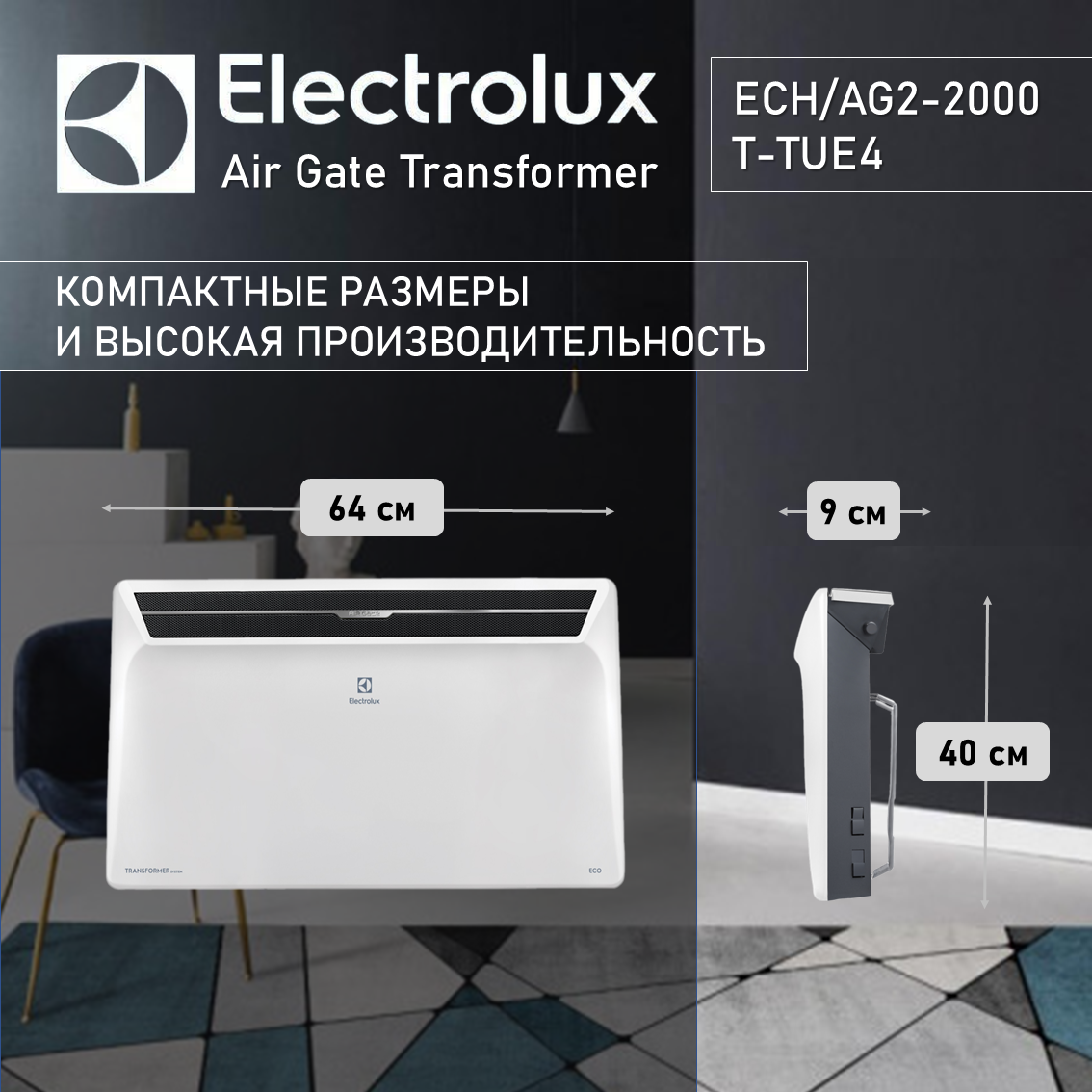 Технология Transformer System представляет абсолютную свободу выбора комплектации конвектора. Инновационная технология Transformer System Air Gate 2, позволяет потребителю свободно управлять комплектацией прибора. Конвектор Transformer System состоит из отопительного модуля (базовая часть) и съемного блока управления. По желанию, можно выбрать настенную (входит в комплектацию модуля) или напольную (приобретается отдельно) установку.Преимущества Отопительный модуль Air Gate Transformer System оснащен современным нагревательным элементом Hedgehog, который выходит на рабочую температуру на 20% быстрее и имеет супер компактные размеры за счет увеличенной площади теплоотдачи. Пониженная на 15% температура элемента и корпуса гарантирует мягкое и комфортное тепло. Ресурс нагревательного элемента Hedgehog 25 лет! Система очистки воздуха BIO Filter System представлена четырьмя фильтрами: антистатическим с антисептическим эффектом, угольным, катехиновыми с биологически активным витамином С Аэродинамическая система Intelligent Air Dynamic усиливает направленный конвективный поток на 37%, что обеспечивает самый быстрый нагрев помещения. Воздухозаборник HD обладает увеличенной площадью для забора и обогрева входящего воздуха Благодаря применению современных технологий и инноваций, срок официальной гарантии на отопительные модули конвекторов Electrolux Transformer System увеличен до 5 лет Модель ECH/AG2-1000T подходит для мягкого обогрева помещений площадью до 15 м²