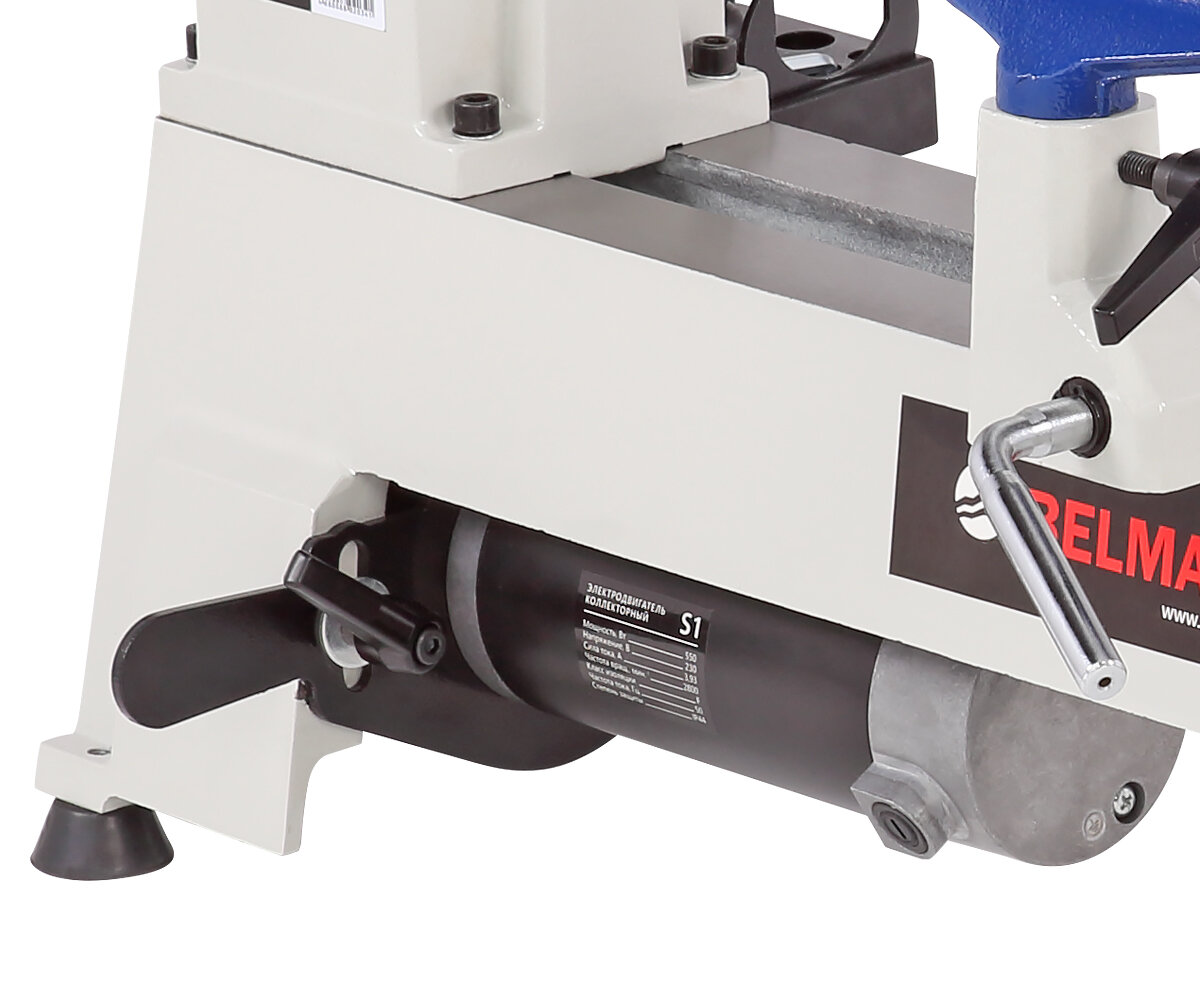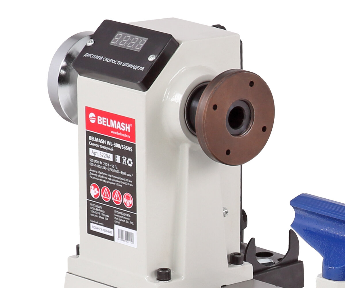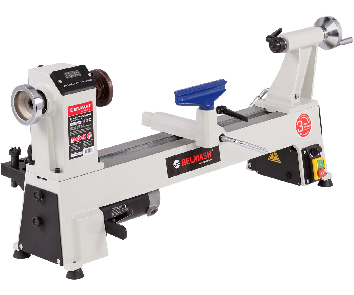Станок токарный BELMASH WL-300/535VS S229A – применяется для обработки древесины c целью придания ей необходимых форм и размеров (проточки, шлифовки и полировки заготовок). На станке выполняют черновое и чистовое точение цилиндрических, конических и фасонных поверхностей и т. п.Преимущества Коллекторный двигатель (550 Вт) Массивная конструкция станины из чугунного литья гарантирует работу с минимумом вибраций Для обеспечения плавного хода, направляющие станины отшлифованы с высокой точностью Наибольший диаметр устанавливаемой заготовки составляет 305 мм, расстояние между центрами - 535 мм, максимальный диаметр обработки над основанием подручника - 230 мм Шпиндель вращается в трех диапазонах скоростей – 650÷1430, 1240÷2790, 1600÷3800 об./мин, в зависимости от положения ремня на ступенях шкивов. Значение оборотов выводится на электронное табло. Регулировка оборотов внутри диапазона – плавная, для этого имеется ручка над выключателем Станок оснащен токовым предохранителем, который защищает от перегрузок Для удобного хранения инструментов в конструкции станка предусмотрена инструментальная консоль В комплекте есть все необходимое для работы – подручник, планшайба, поводковый патрон, вращающийся центр
