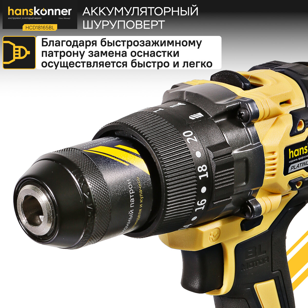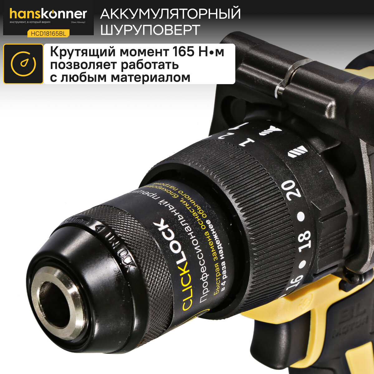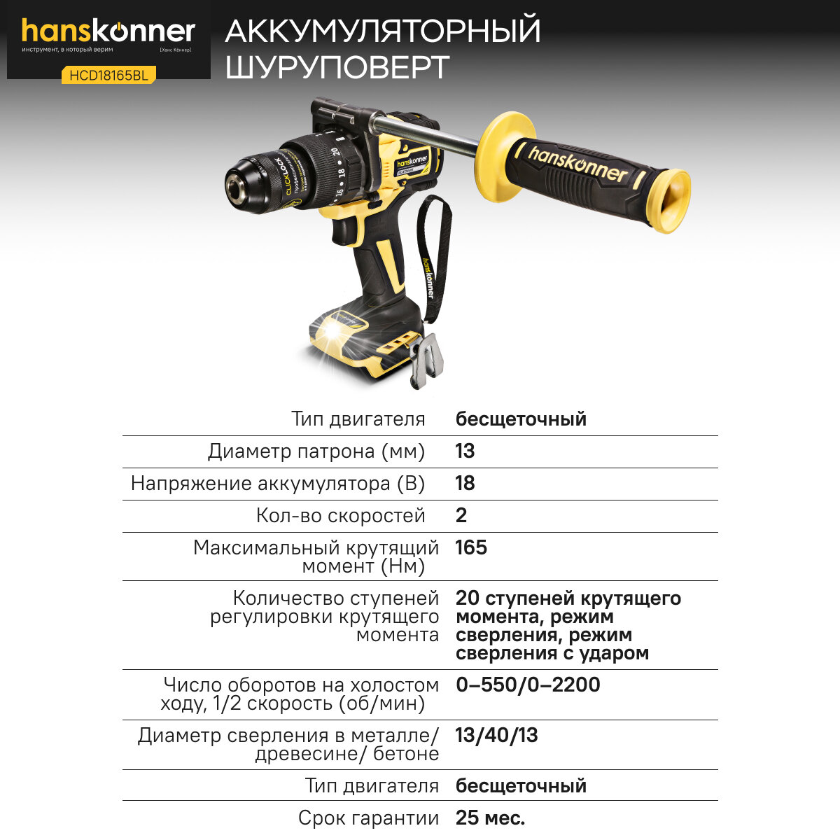 Аккумуляторная ударная дрель-шуруповерт Hanskonner HCD2065BLIC подходит для любых работ, в том числе в стесненных условиях и труднодоступных местах без снижения производительности и потери качества работ. Крутящий момент 65 Н•м позволяет работать с любым материалом от древесины до металлопроката. Компактный и легкий бесщеточный двигатель имеет наиболее выгодные параметры работы.Преимущества Крутящий момент 65 Н•м позволяет работать с любым материалом от древесины до металлопроката Фальш-кольцо: защита патрона от повреждений в узких, труднодоступных местах Блокировка шпинделя иширокая муфта быстрозажимного патрона ClickLock позволяют менять оснастку одной рукой изакреплять еёснаилучшей фиксацией Фирменные подшипники C&U увеличивают ресурс работы инструмента на 50% Прочный кейс единой системы хранения инструмента HANSTORAGE в комплекте