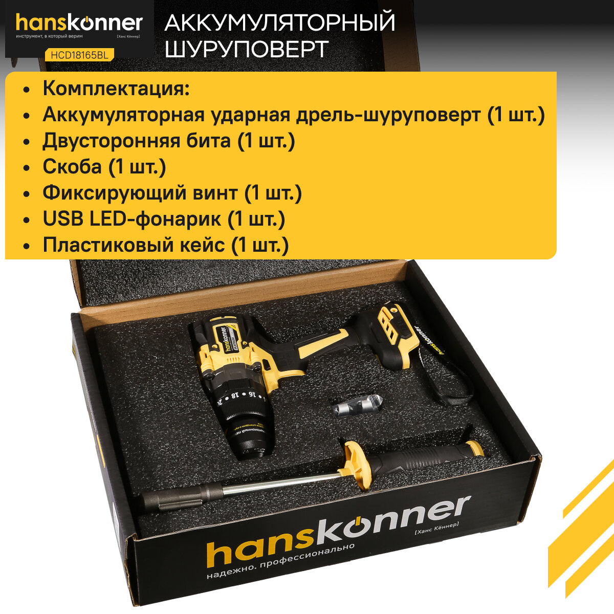 | Аксессуары в комплекте | Аккумуляторная ударная дрель-шуруповерт (1 шт) Аккумуляторная батарея (2 шт) Зарядное устройство (1 шт) Двусторонняя бита (1 шт) Скоба (1 шт) Фиксирующий винт (1 шт) USB LED-фонарик (1 шт) Пластиковый кейс (1 шт) Инструкция по безопасности (1 шт) Инструкция по эксплуатации (1 шт) |