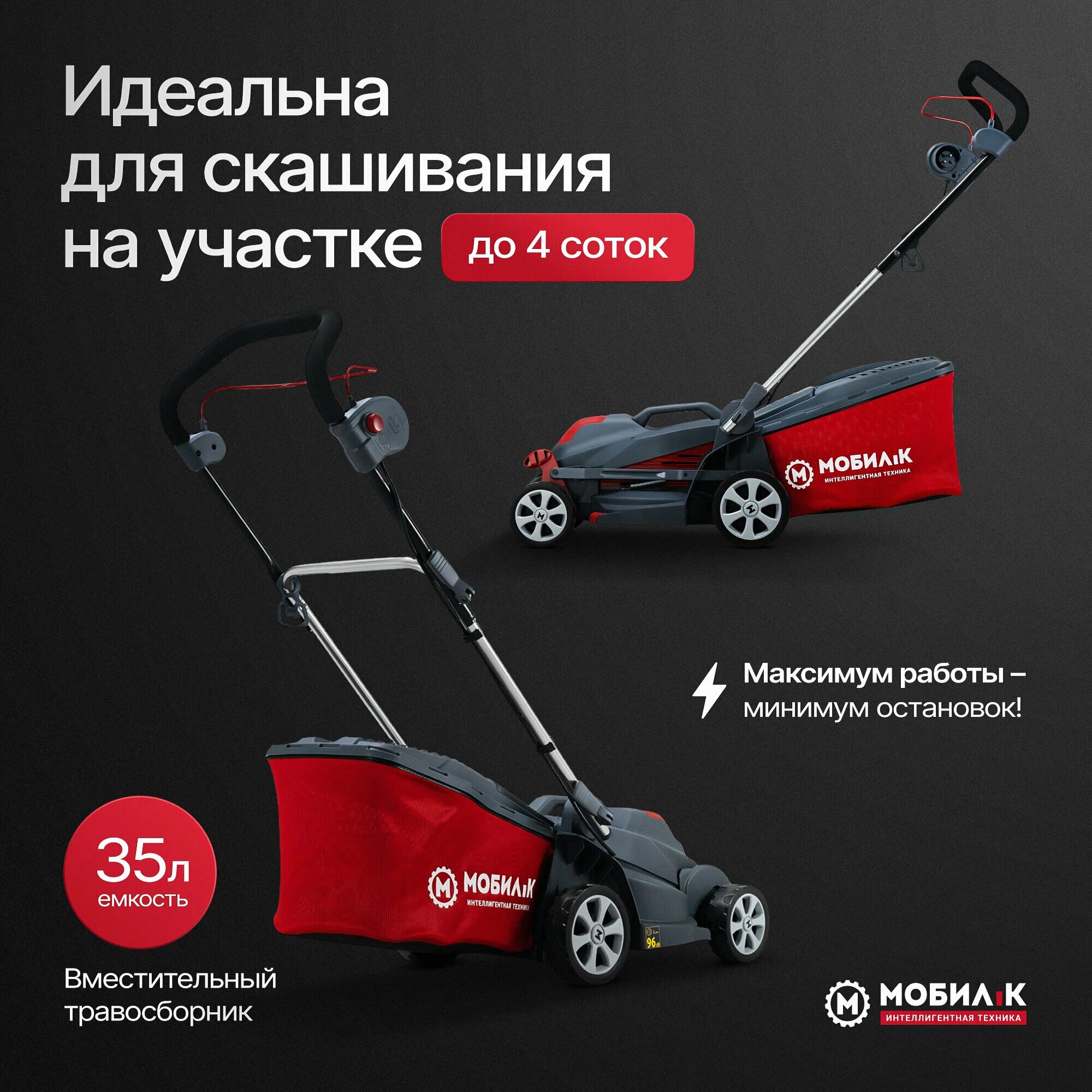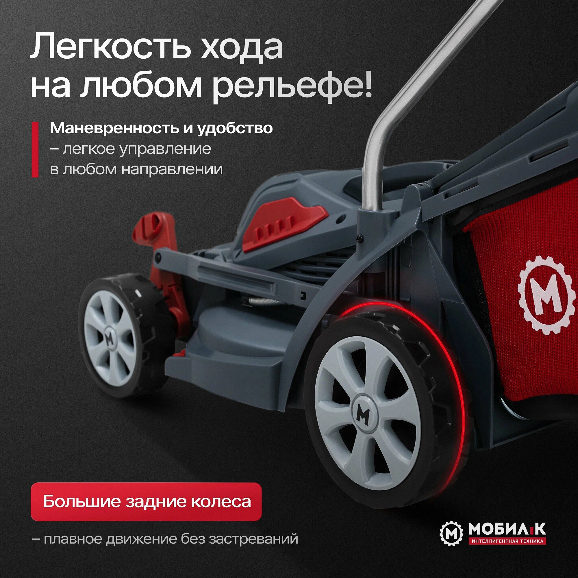 Электрическая газонокосилка МОБИЛ К ХМЕ34 КОМФОРТ предназначена для ухода за газонами площадью до четырех соток. Благодаря сочетанию мощности 1 500 Вт и отличной маневренности она позволит максимально быстро справиться со стоящей перед вами задачей. Ширина скашивания составляет 34 см. Управлять газонокосилкой удобно и правой, и левой рукой – вы легко объедете кустарники, клумбы и другие препятствия.Преимущества Газонокосилка оснащена травосборником объемом 35 литров – можно реже делать паузы в работе, чтобы очистить его от травы Благодаря специальному индикатору проще контролировать его заполнение Верхняя часть травосборника сделана из пластика, нижняя – из ткани Благодаря этому его можно компактно сложить, чтобы сэкономить место при хранении и транспортировке техники Высота скашивания настраивается одним движением руки – есть шесть ступеней от 20 до 70 мм Специальное устройство помогает аккуратно скашивать траву вдоль заборов, декоративных ограждений и т.д. Большие колеса гарантируют легкость хода и позволяют без проблем преодолевать неровные участки Пользователь может зафиксировать электрокабель так, чтобы он не мешал в процессе работы