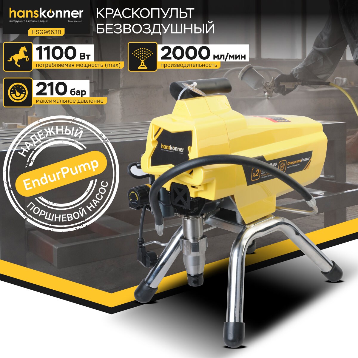 Краскопульт Hanskonner HSG9663B безвозвоздушный 1100Вт 2.0л/мин 210бар 15м шланг