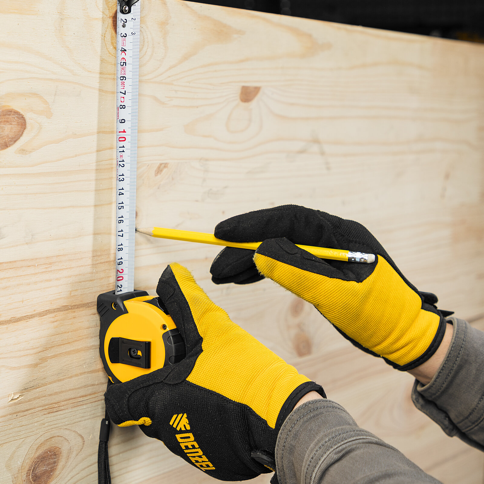Карманная рулетка Denzel предназначена для проведения линейных измерений. Двухкомпонентный корпус для защиты при случайных падениях (ABS пластик + термопластичная резина). Рулетка оснащена прижимной клипсой для ремня. Возвратная пружина изготовлена из стали 65 Mn. Сертификация СЕ (LNE). Подвижный зацеп позволяет производить измерения внутренних и наружных поверхностей с учетом его толщины. Для удобства в работе рулетка оснащена боковой кнопкой-паузой и ремешком.Рулетка Denzel 31543в двухкомпонентном корпусе, с кнопкой-паузой, с полотном шириной 25 мм и длиной 5 м, используется для измерения расстояний и размеров предметов Удобна для работы в труднодоступных местах. Стальная лента с эмалевым покрытием и защитной пластиной в месте крепления зацепа рассчитана на долгий срок службы Рулетка будет полезна во время строительства и ремонта, а также пригодится в быту. Преимущества Ударопрочность— двухкомпонентный корпус из ABS-пластика и вставками из термопластичной резины устойчив к механическим повреждениям Удобная эксплуатация— клавиша-фиксатор удерживает ленту в вытянутом положении, облегчая проведение измерений Эргономичность— рулетка снабжена прочным ремешком для подвешивания на запястье Дополнительные возможности— поясной зажим позволяет закрепить рулетку на ремне, чтобы освободить руки во время работы Продуманная упаковка— открытый блистер позволяет осмотреть изделие перед покупкой