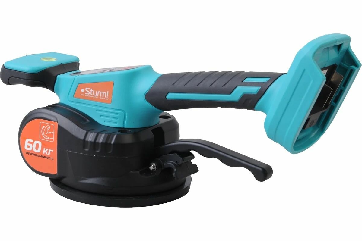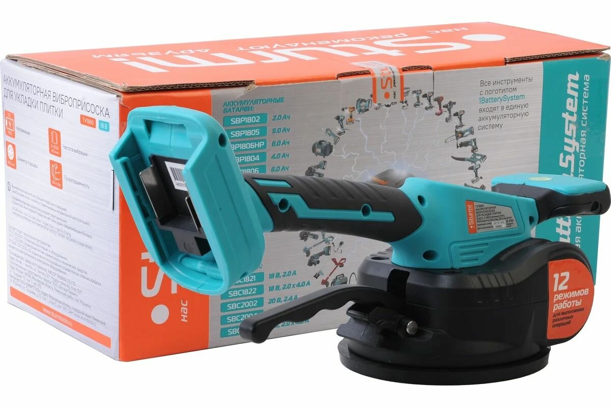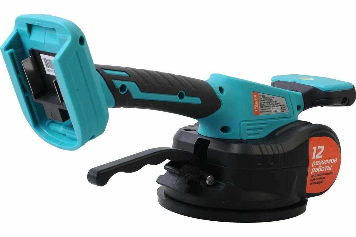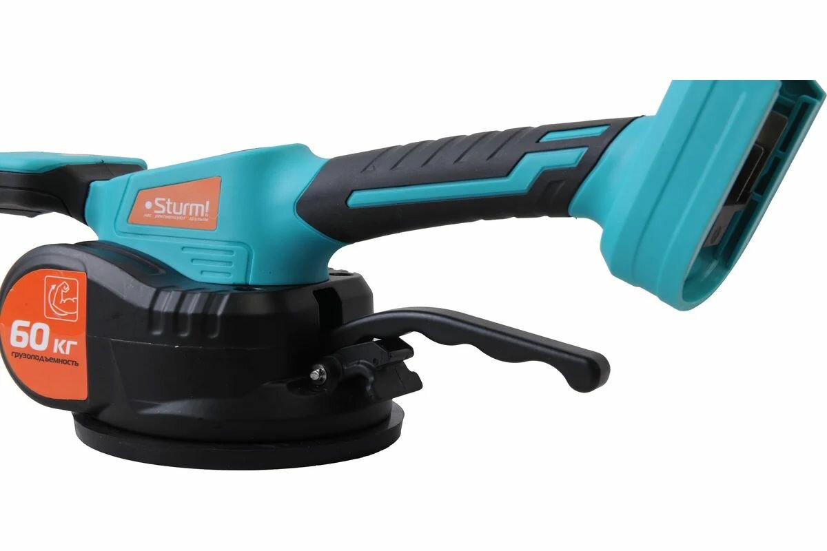 Аккумуляторная виброприсоска для укладки плитки Sturm! TV1860 — профессиональный инструмент, разработанный для переноса, подъема, выравнивания при укладке напольной и настенной плитки больших размеров и веса, керамогранита, гранитных и мраморных плит. Грузоподъемность — 60 кг. Диаметр подошвы — 123 мм. Небольшой размер и легкий вес делают данный инструмент очень удобным в использовании. Постоянная и равномерно распределенная вибрация не повреждает плитку, даже если в ней были выполнены отверстия или разрезы больших размеров. 12 режимов регулировки частоты вибрации для выполнения различных операций. Встроенный пузырьковый уровень для легкого измерения угла отклонения поверхностей.Преимущества 12 режимов работы для выполнения различных операций Встроенный пузырьковый уровень для легкого измерения угла отклонения поверхностей Алюминиевая коробка передач и подъемная штанга: увеличенный рабочий ресурс