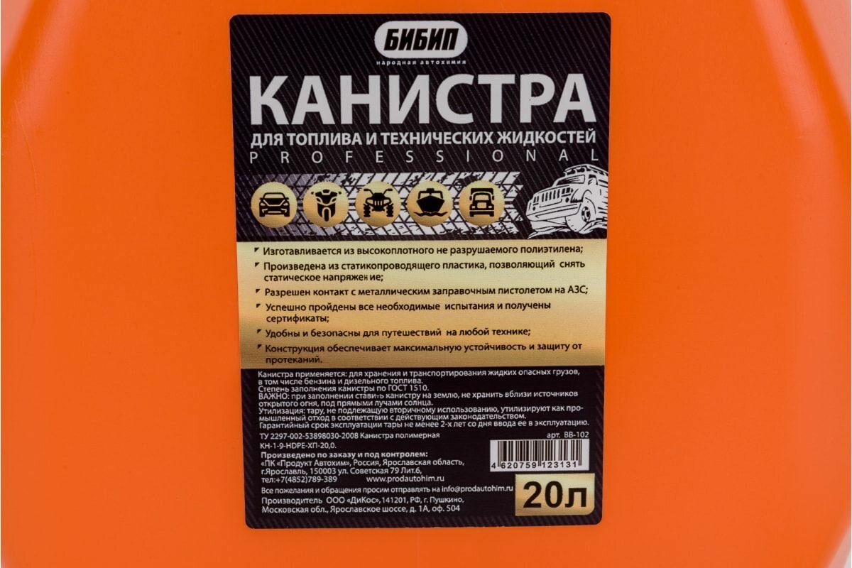 Канистра ГСМ Professional 5 л Бибип усиленная с крышкой и лейкой применяется для хранения и транспортирования жидких опасных грузов, в том числе бензина и дизельного топлива.В комплект входит гибкий носик для удобной заправки автомобиля, катера, мотоблока и другой техники.Канистра сертифицирована.