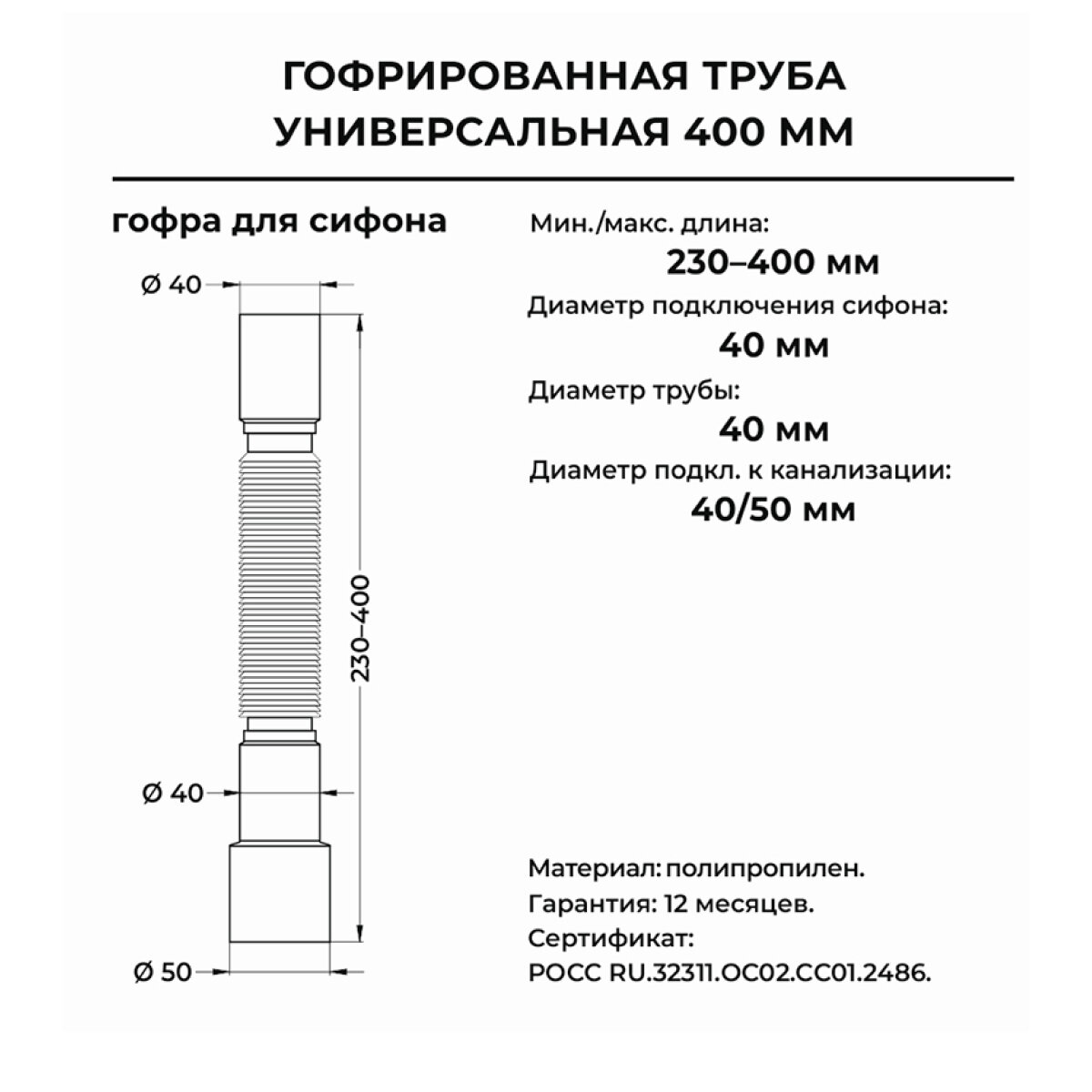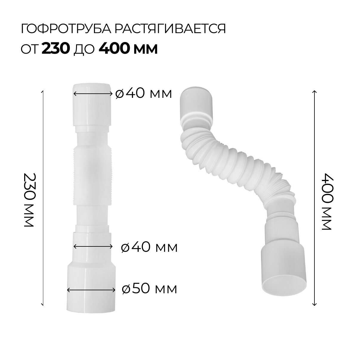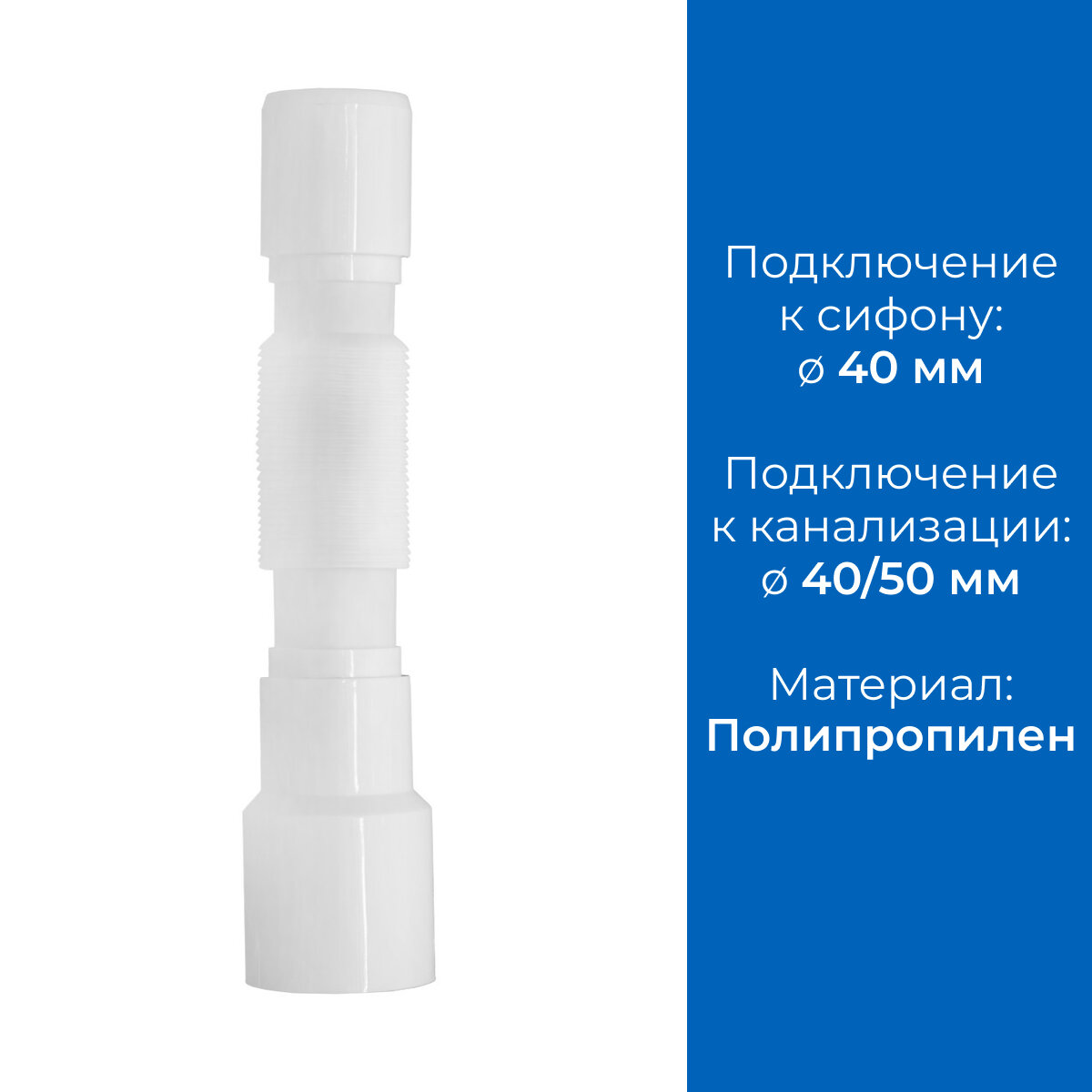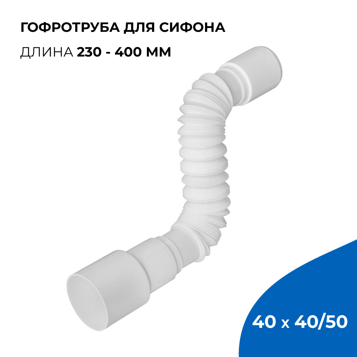 Гибкая труба 800мм, 40 х 40/50 используется в бутылочных и прямоточных сифонах, для подсоединения к системе канализации. За счёт формы "гармошки"изделие можно согнуть любым образом, удлинить или укоротить, что сильно облегчает подсоединение устройства к канализации.Преимущества Выход трубы универсальный с возможностью подключения к канализационной трубе диаметром 40 или 50 мм Труба изготовлена из первичного полипропилена, что положительно влияет на её прочность, долговечность, а также устойчивость к температурным воздействиям