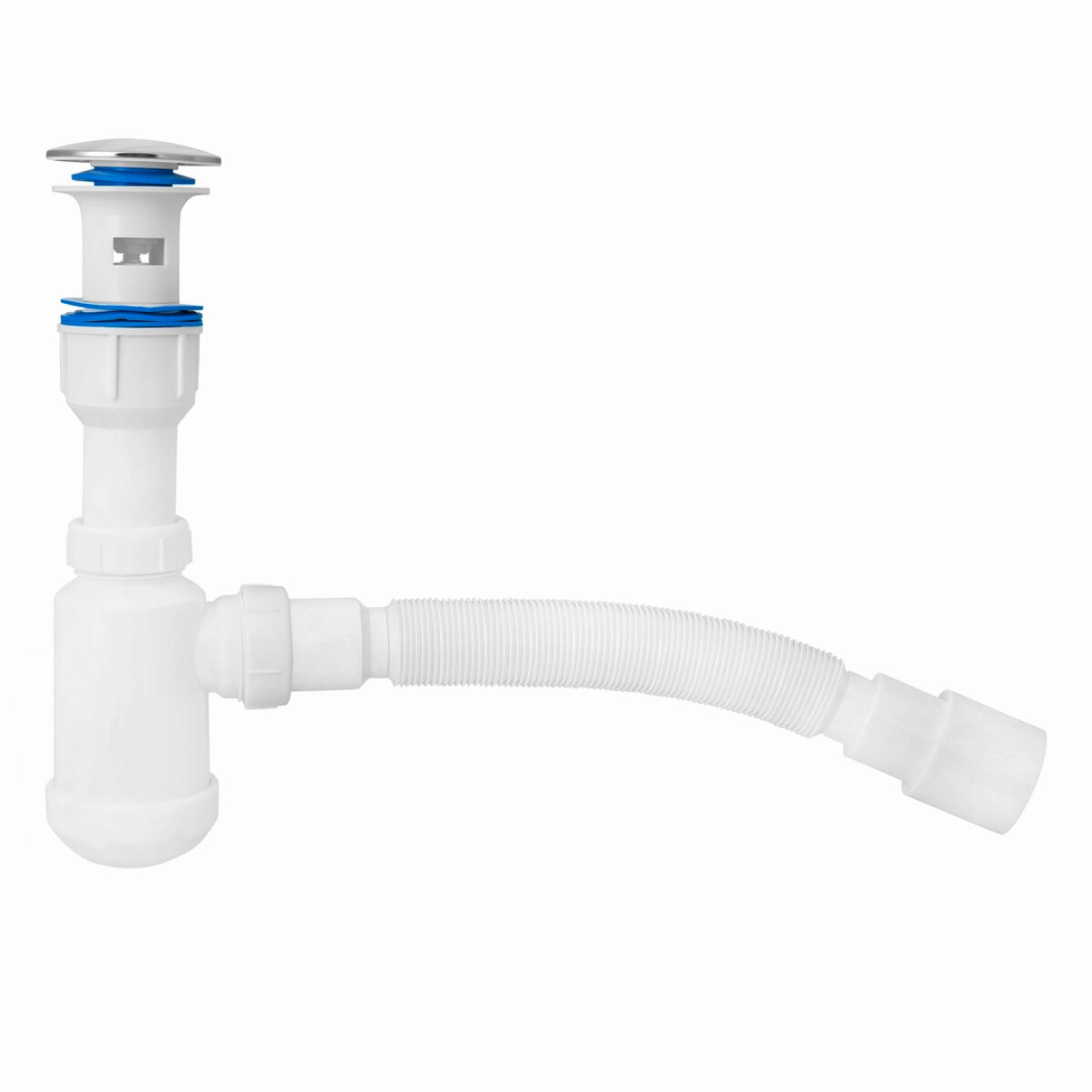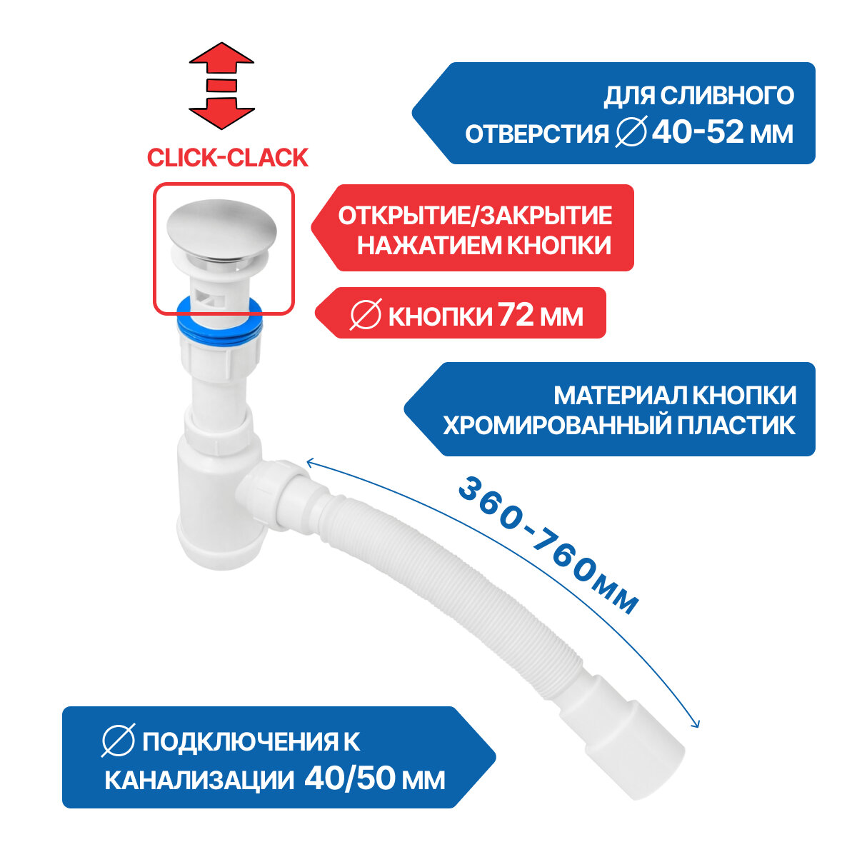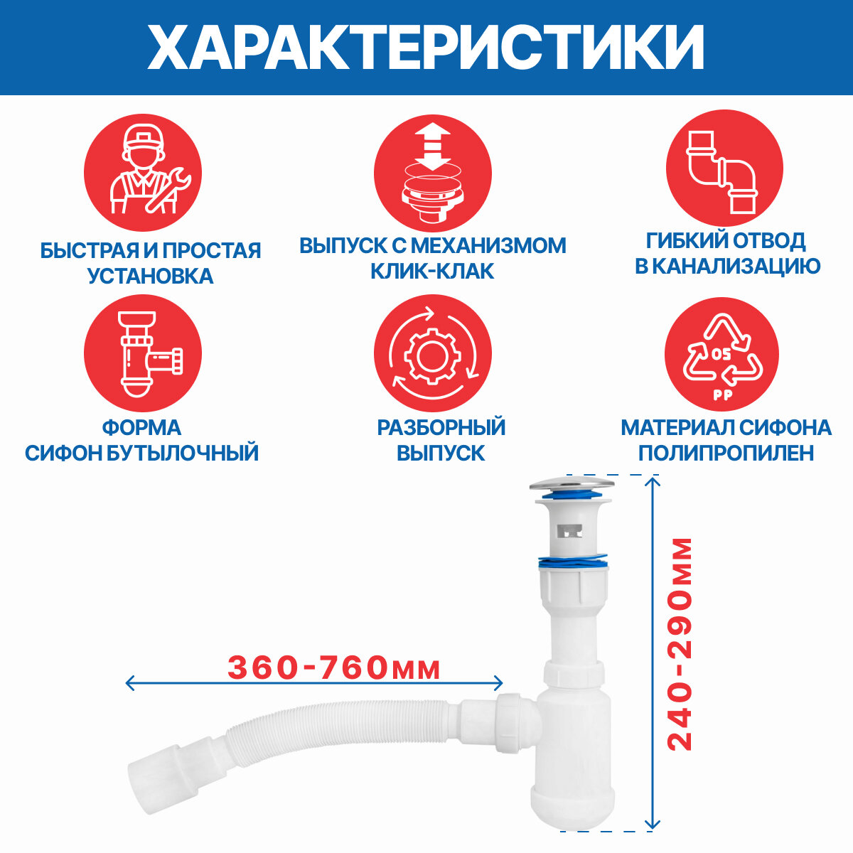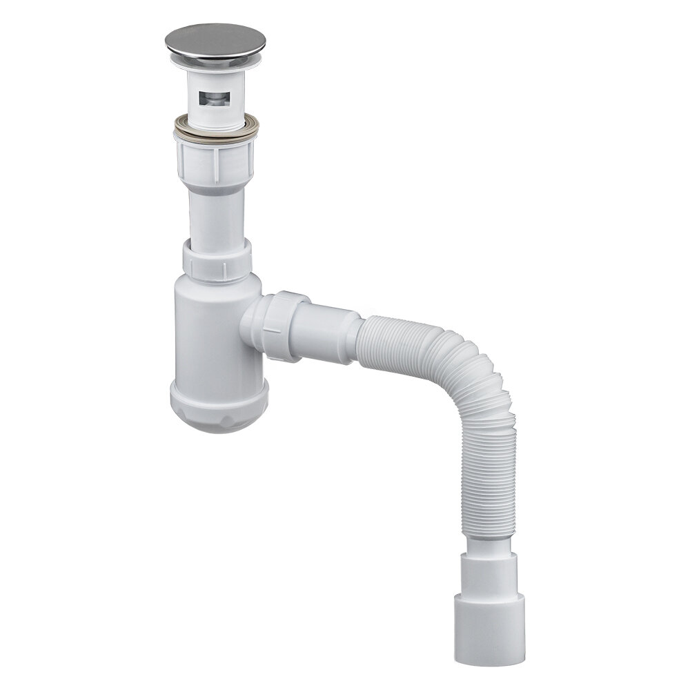 Сифон MasterProf с пластиковым выпуском клик-клак бутылочного типа применяется для соединения раковины умывальника с канализационной системой. На данном сифоне реализован выпуск с механизмом Click-Clack ,резьба для его установки 1 1/4". Система Click-Clack, основана на работе пружины, под действием которой открывается или закрывается клапан позволяющий перекрывать сливное отверстие, что значительно экономит воду при мытье посуды или стирке мелких вещей. Выпуск оснащён отверстием для подключения встроенного перелива, позволяющего выпускать воду из раковины при ее переполнении. Подходит для умывальников с диаметром сливного отверстия 40-52мм.Преимущества Сифон поставляется в максимально собранном виде, что обеспечивает его сверхбыструю и простую установку В комплектацию сифона входит универсальная гофрированная труба с возможностью подключения сифона к канализационной трубе диаметром 40 или 50 мм Корпус сифона изготовлен из первичного полипропилена, что положительно влияет на его прочность, долговечность, а также устойчивость к температурным воздействиям Материал уплотнителей термоэластопласт- высокопрочный, высокоэластичный экологически чистый материал, устойчивый к перепадам температур и химическим воздействиям