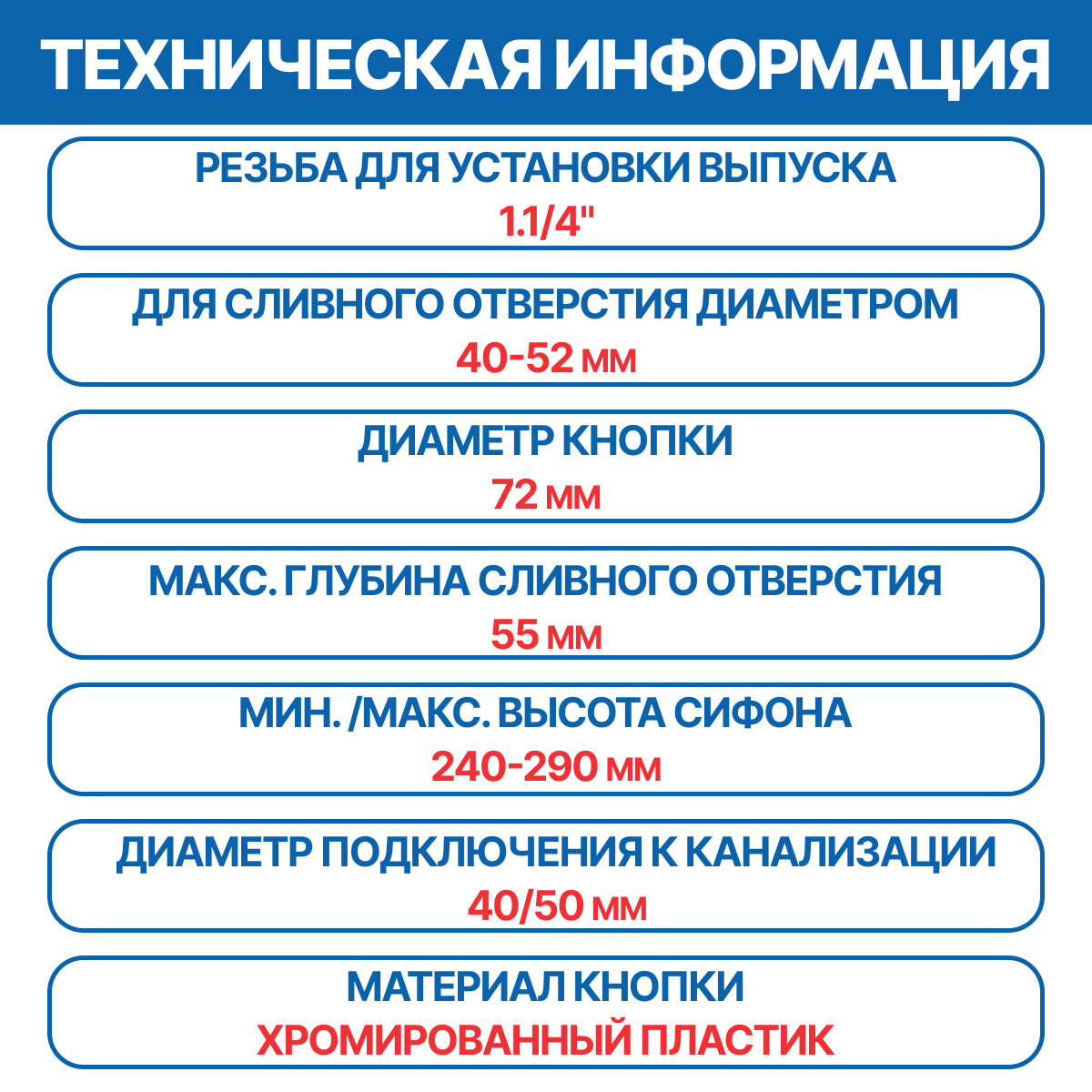 | Диаметр выпуска (отверстия для слива) | 1 1/4 дюйма |